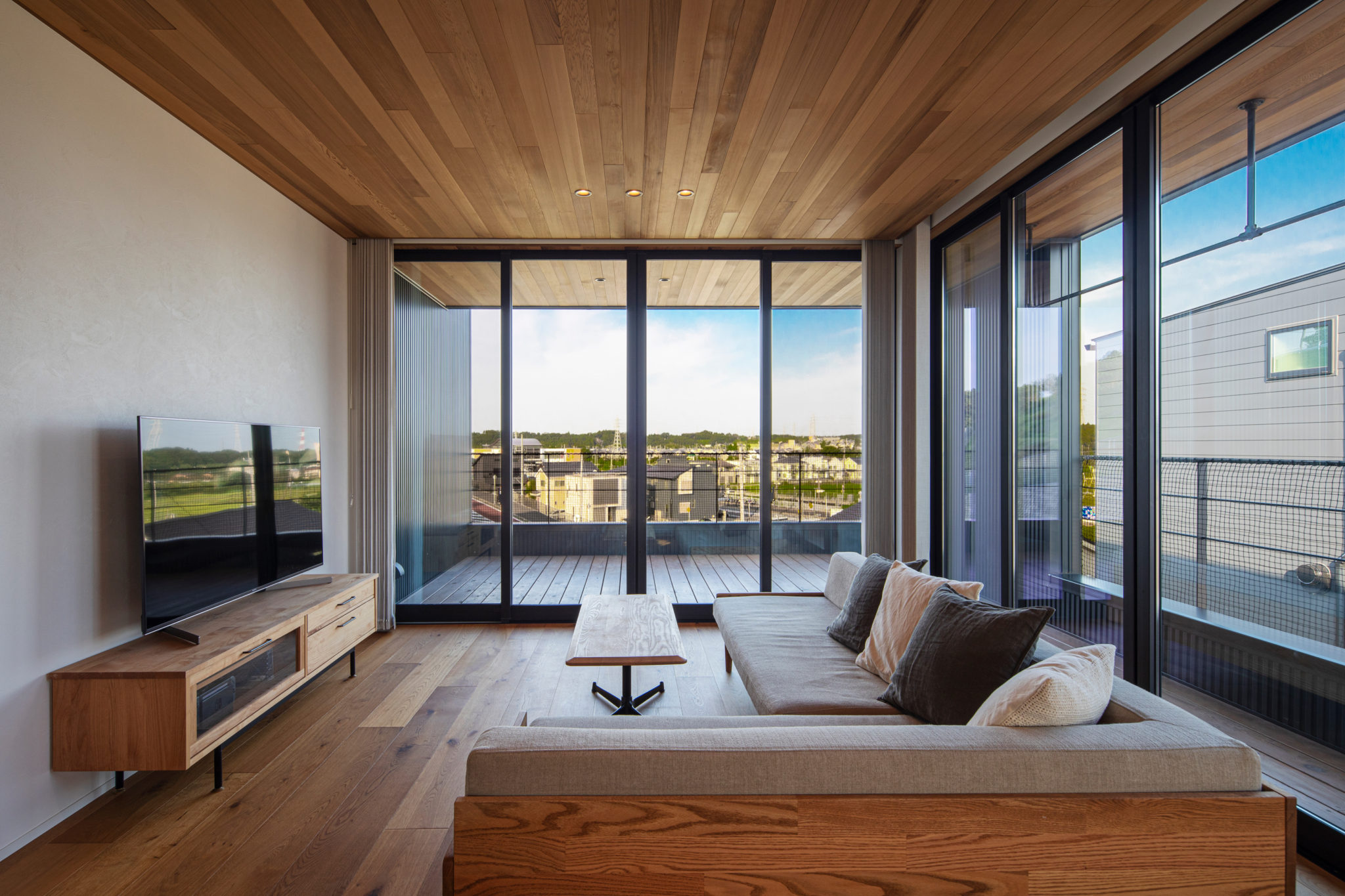 板張りの向きを外方向に揃えることで、視線が自然と外へ誘導され、眺望が際立ちます。
