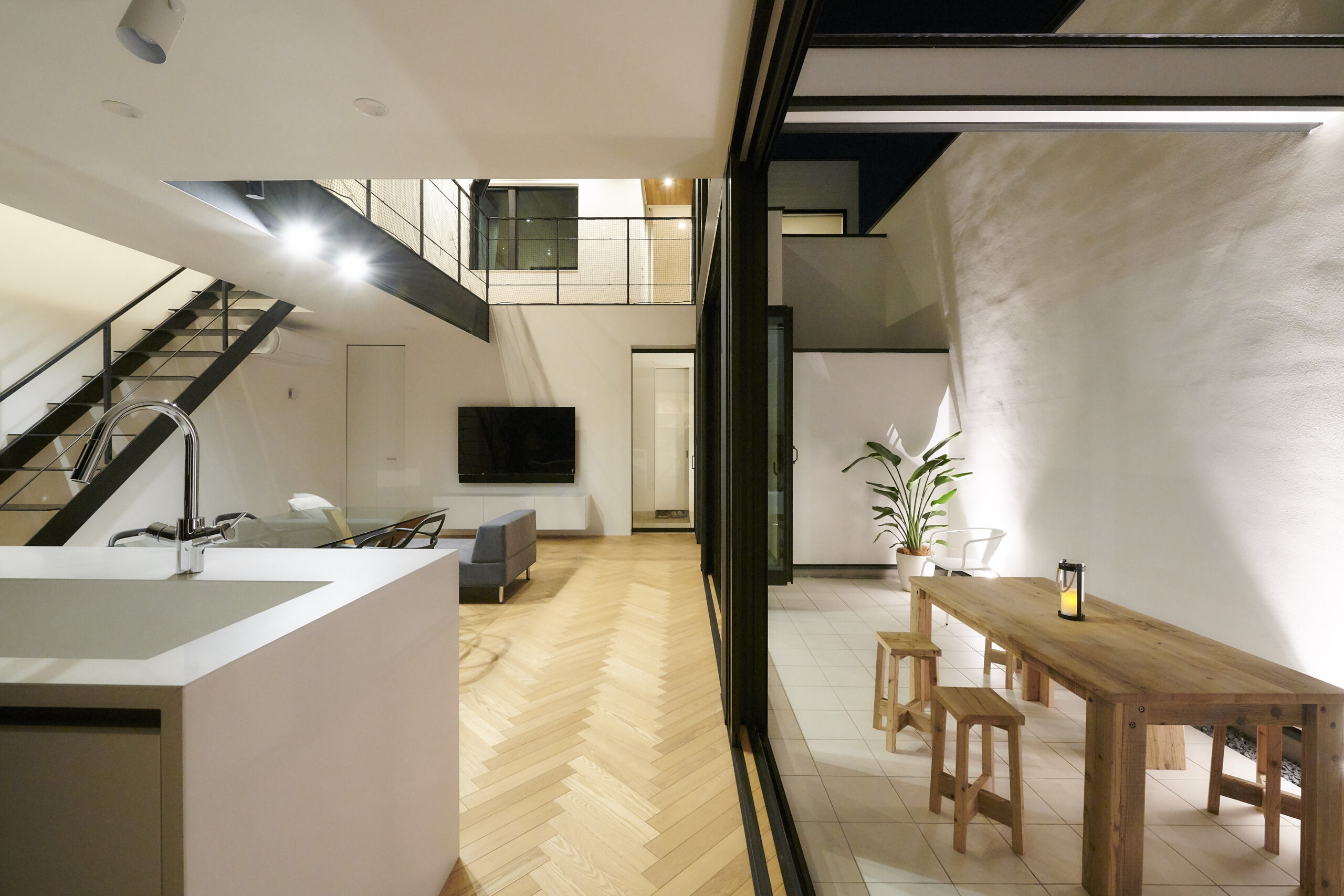 視線の抜けをつくりづらい周辺環境の中で、壁に囲まれた中庭に向かって大開口を設けることで、開放的な空間を実現しています。