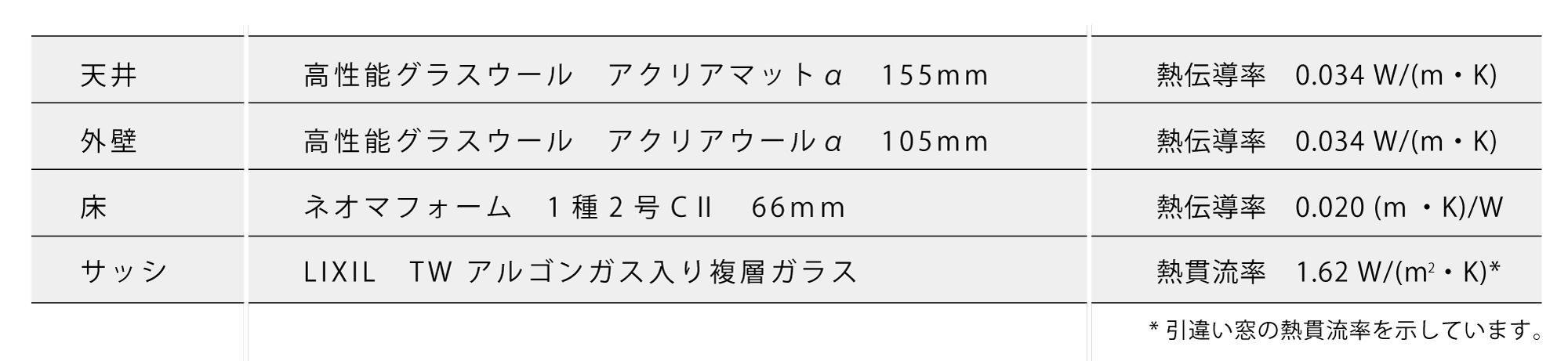 細部にわたって断熱性にこだわることで、外皮平均熱貫流率Ua値0.52 W/m2Kの断熱性を実現しています。