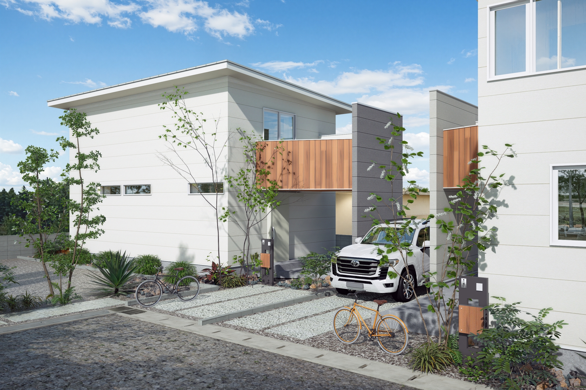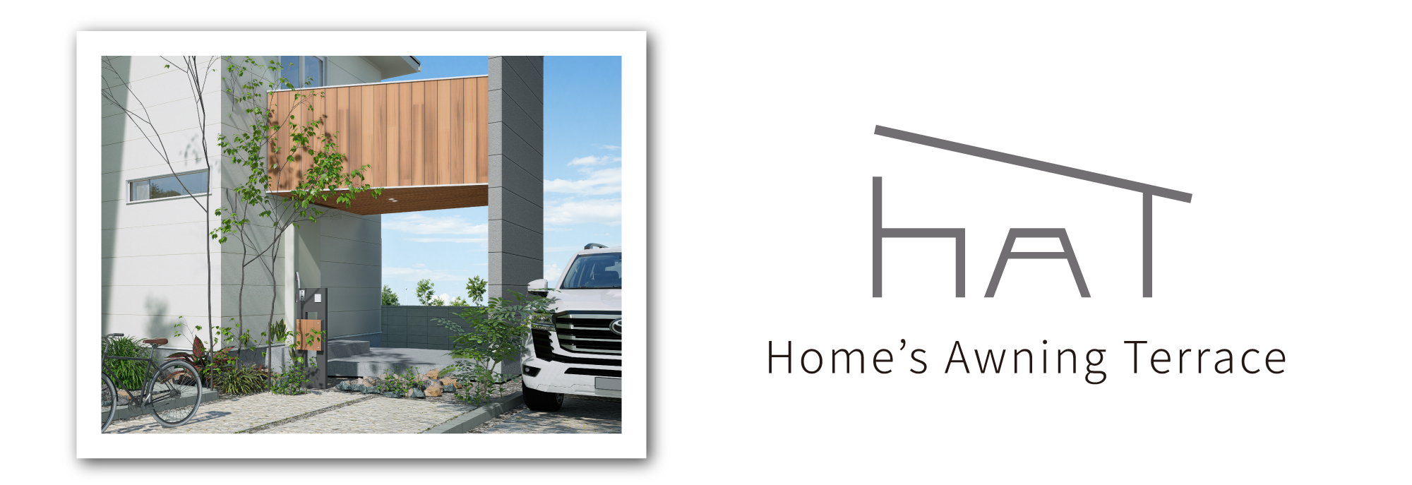 木目調の軒天と外壁を連続させることで、素材の一体感と水平ラインの美しさを際立たせています。