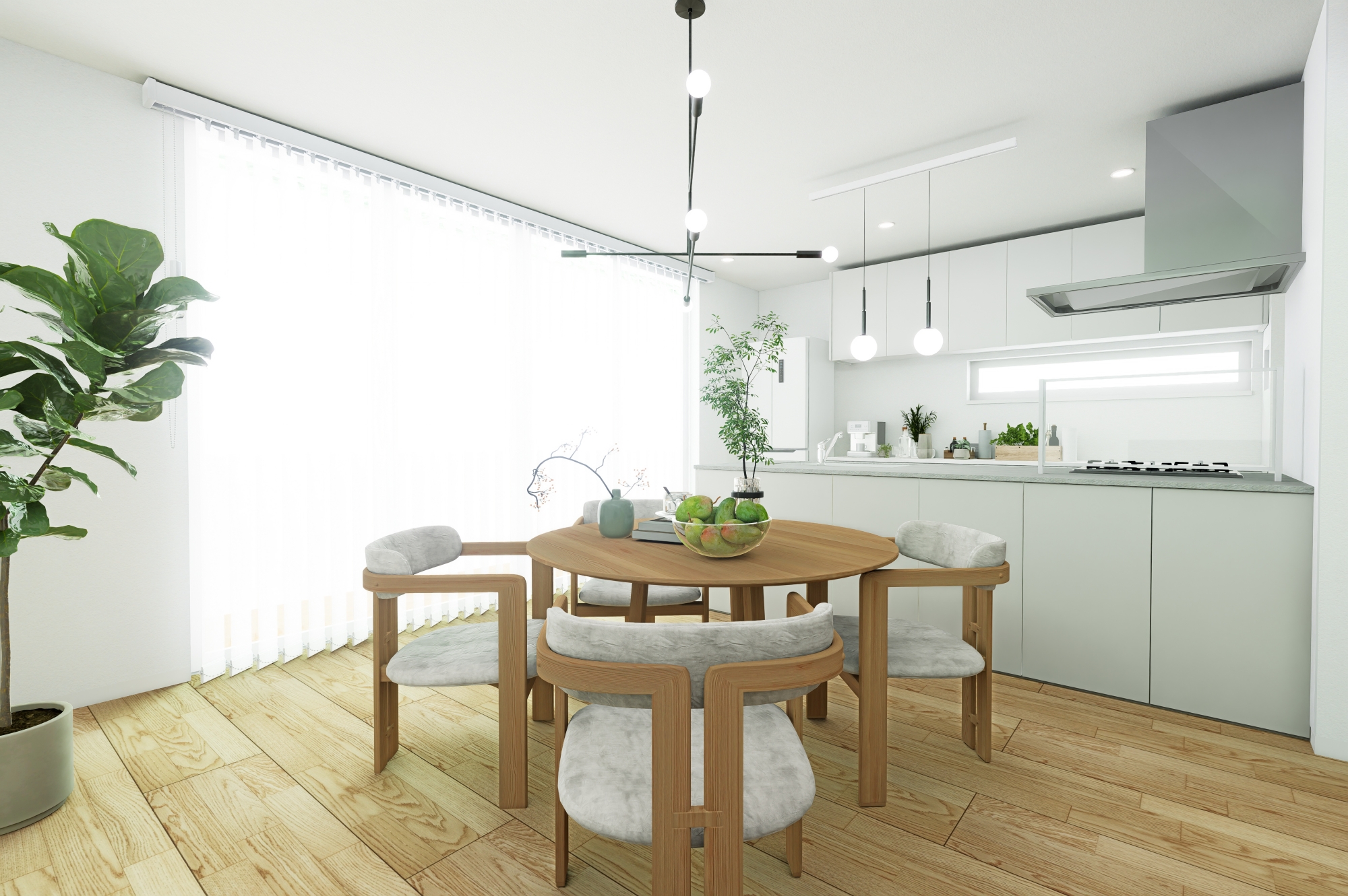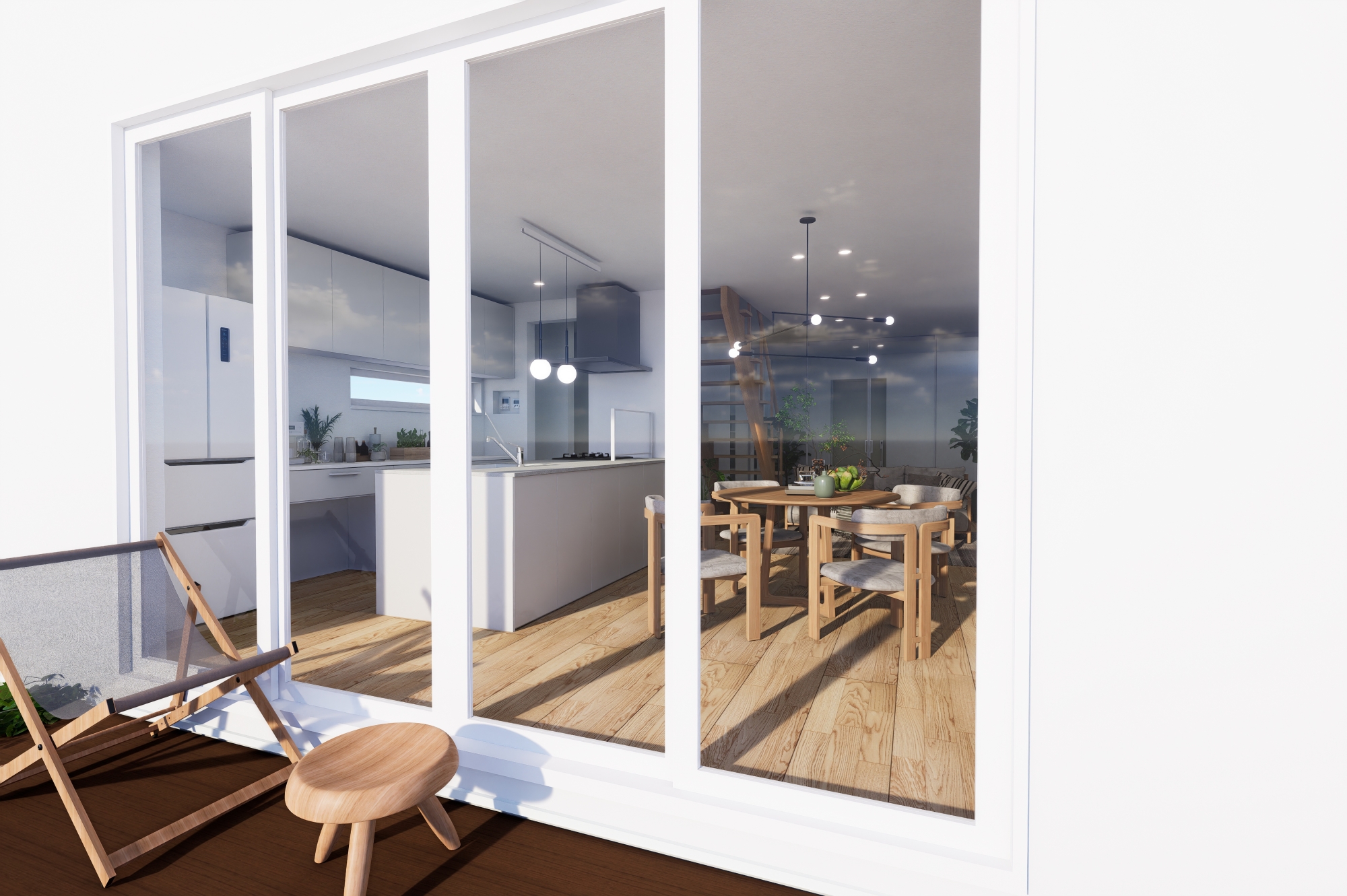 1階にLDKを配置し、4連の掃き出し窓から光を取り込む、明るく開放的なプラン。