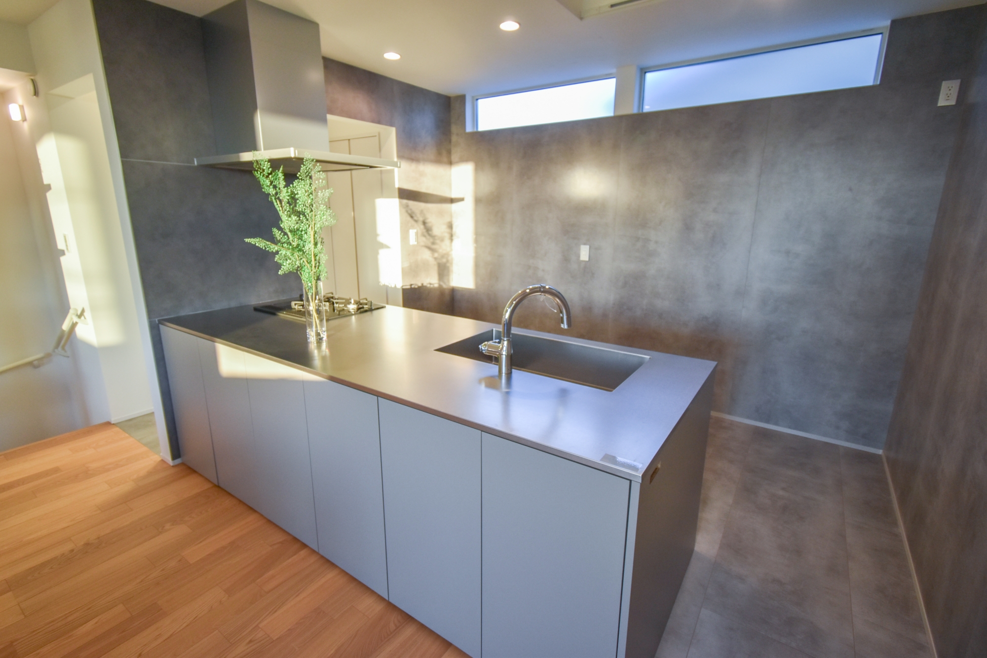 落ち着きのあるグレートーンの外壁には、ジョリパッドと塗り壁調サイディングを採用しています。