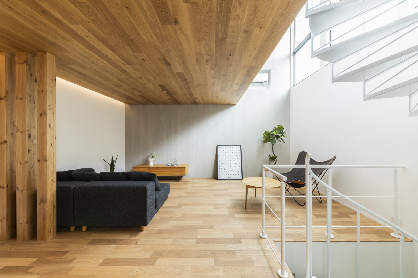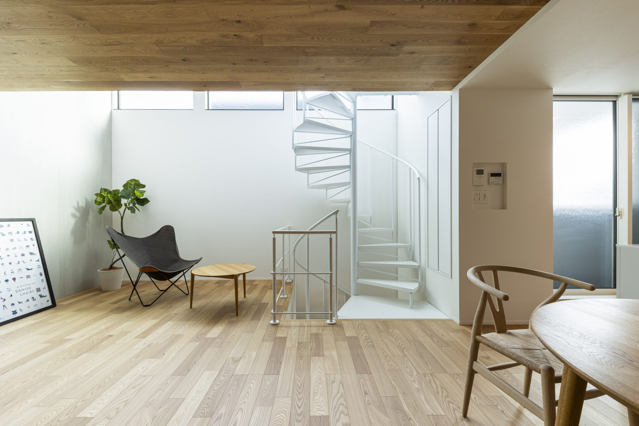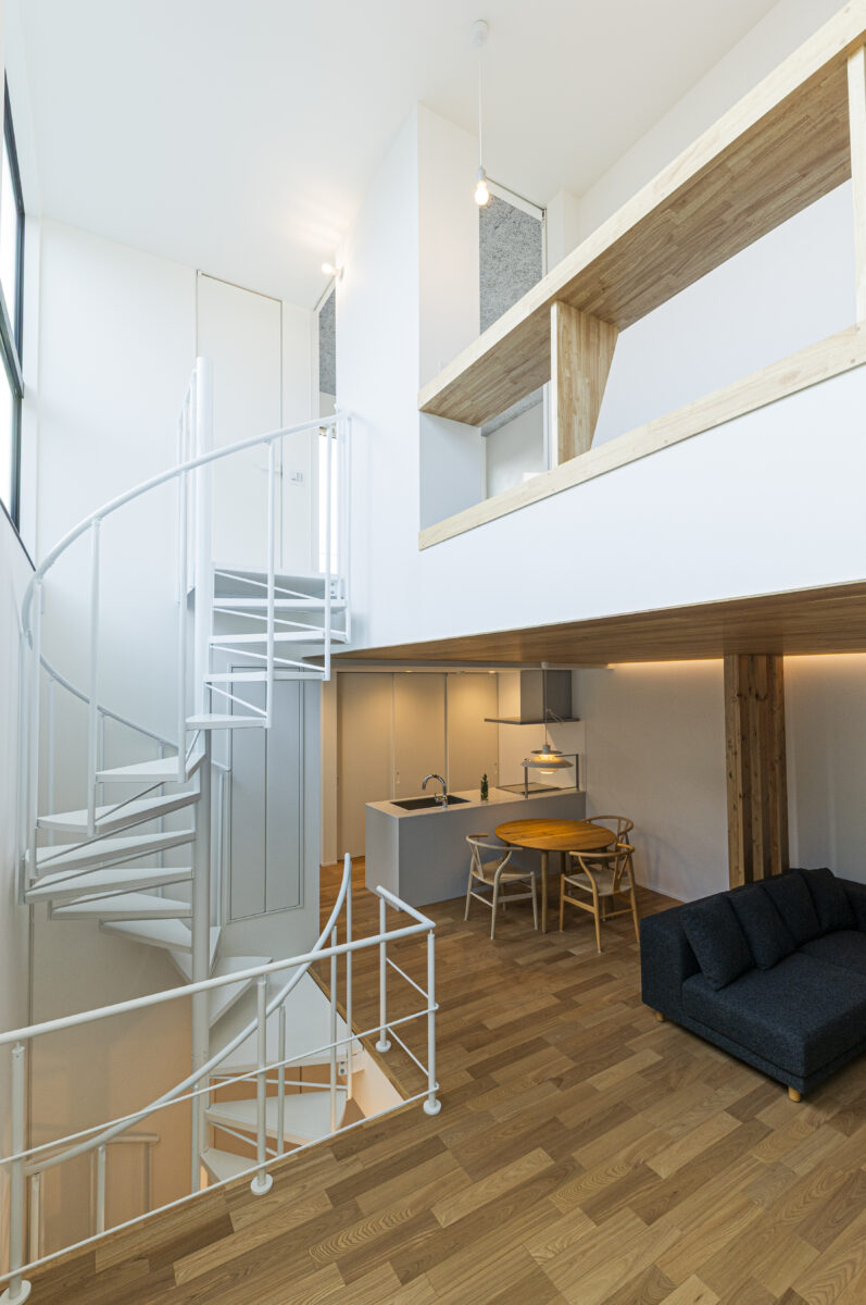 住まいの中央に据えた螺旋階段が各階をつなぎ、家族の気配を伝える縦方向の広がりを生み出します。