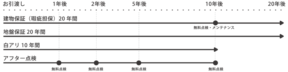 専属のアフターサービススタッフによる定期点検に加え、お引渡しから20年以内にお住まいに瑕疵があった場合には補修費用が補填されます。