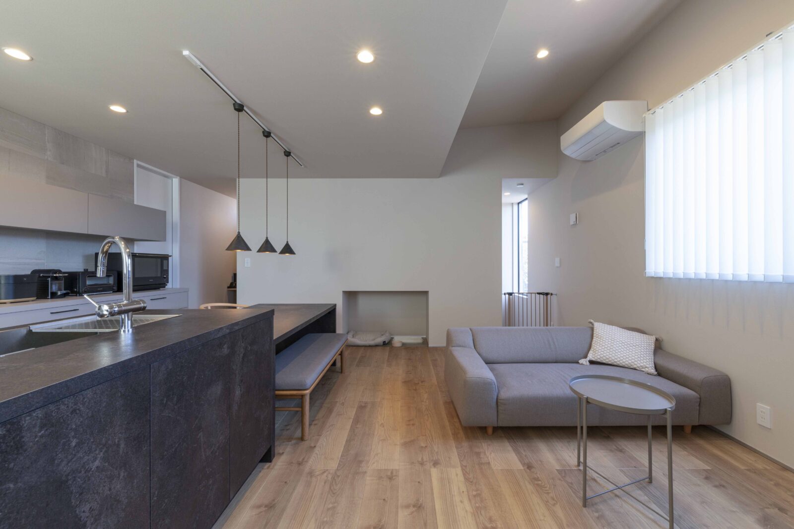 リビングに床暖房、食事や寝る空間として壁をくりぬいたペット用スペースを設け、プライベートを充実させる住空間とペットと共に暮らす工夫がいっぱいの心地よい住宅となりました。
