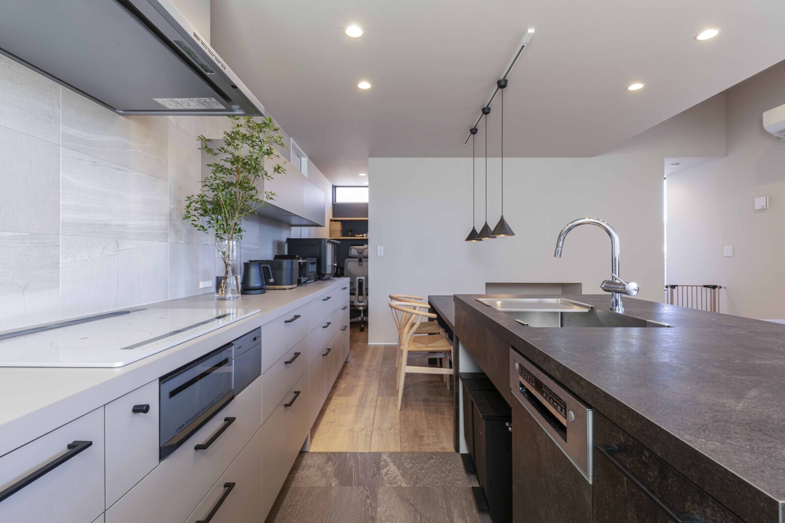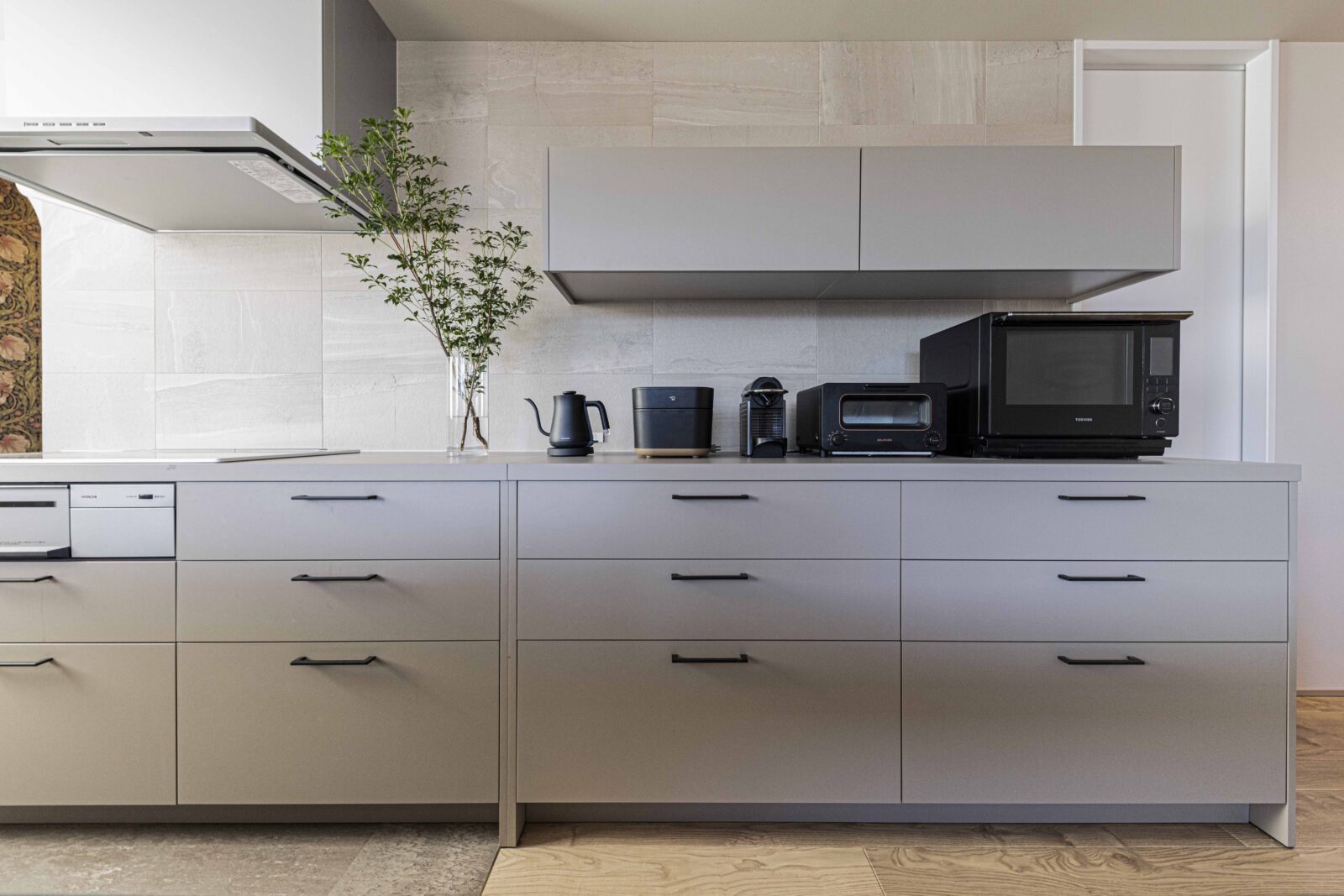 アイボリーの壁紙が持つ柔らかい印象とチャコールグレーのグラフテクトキッチン、そしてナチュラルグレーのインテリアで統一され、繊細でニュアンスのある雰囲気があります。