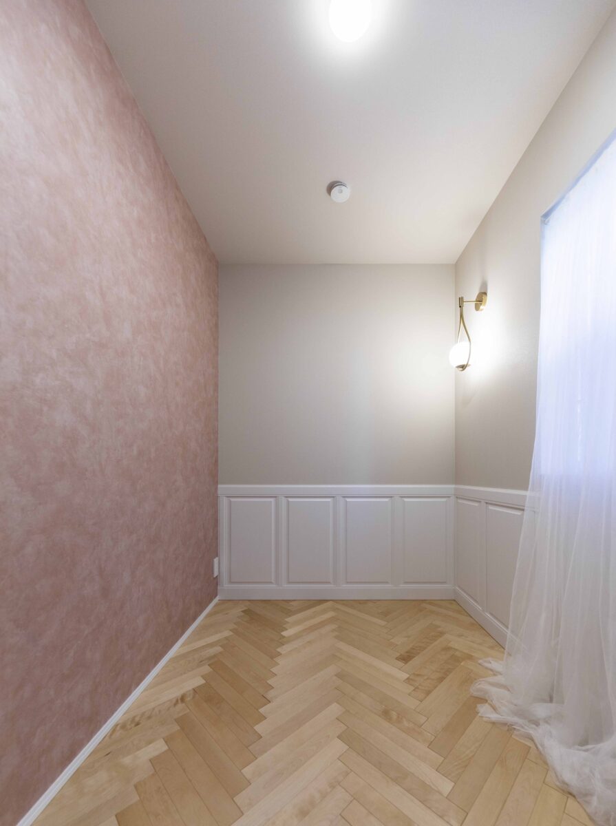 Baroque 建築エリア 千葉県 建築年 2023 敷地面積 89.71m² 延床面積 97.72m² 開口部を減らしプライバシー性を高めた、シンプルモダンなファサード。 外壁をアイボリーとお施主様の好きなグリーンカラーの塗り壁で仕上げました。 LDKを2階にすることで周囲からの視線を遮り、プライベートを確保しながらも心地の良い広がりを持つ空間となっています。 アイボリーの壁紙が持つ柔らかい印象とチャコールグレーのグラフテクトキッチン、そしてナチュラルグレーのインテリアで統一され、繊細でニュアンスのある雰囲気があります。 アーチ壁のパントリーから見えるモリスの壁紙が、現代的ながら遊び心がある工夫を演出しています。 リビングに床暖房、食事や寝る空間として壁をくりぬいたペット用スペースを設け、プライベートを充実させる住空間とペットと共に暮らす工夫がいっぱいの心地よい住宅となりました。