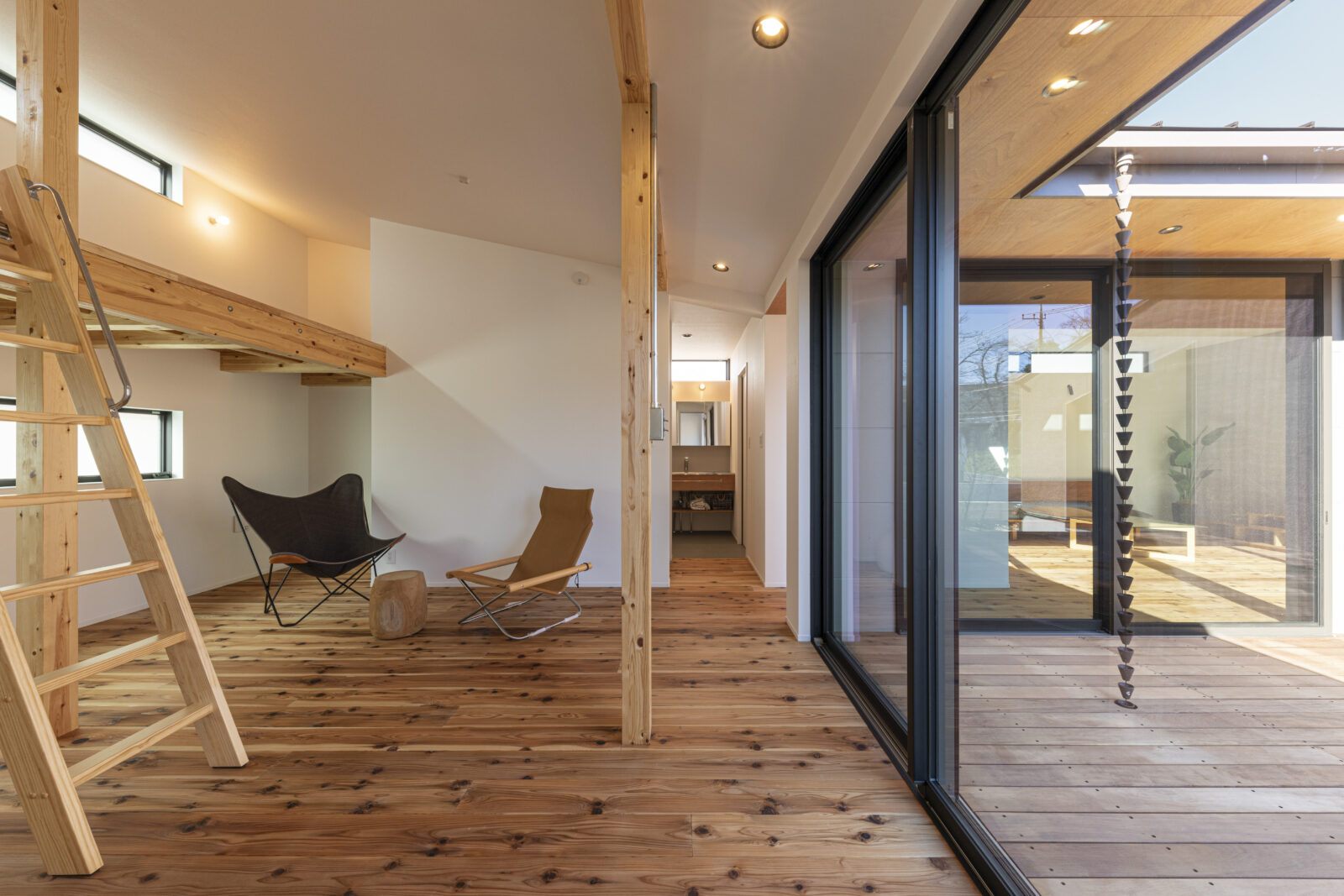 各ゾーンに大きな窓を設けることで、どこからでも L 字型ウッドデッキにアクセスできる回遊性を持つ動線となり、内と外がシームレスにつながる伸びやかな空間としました。