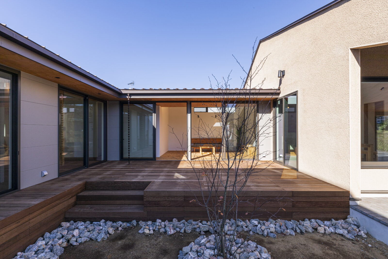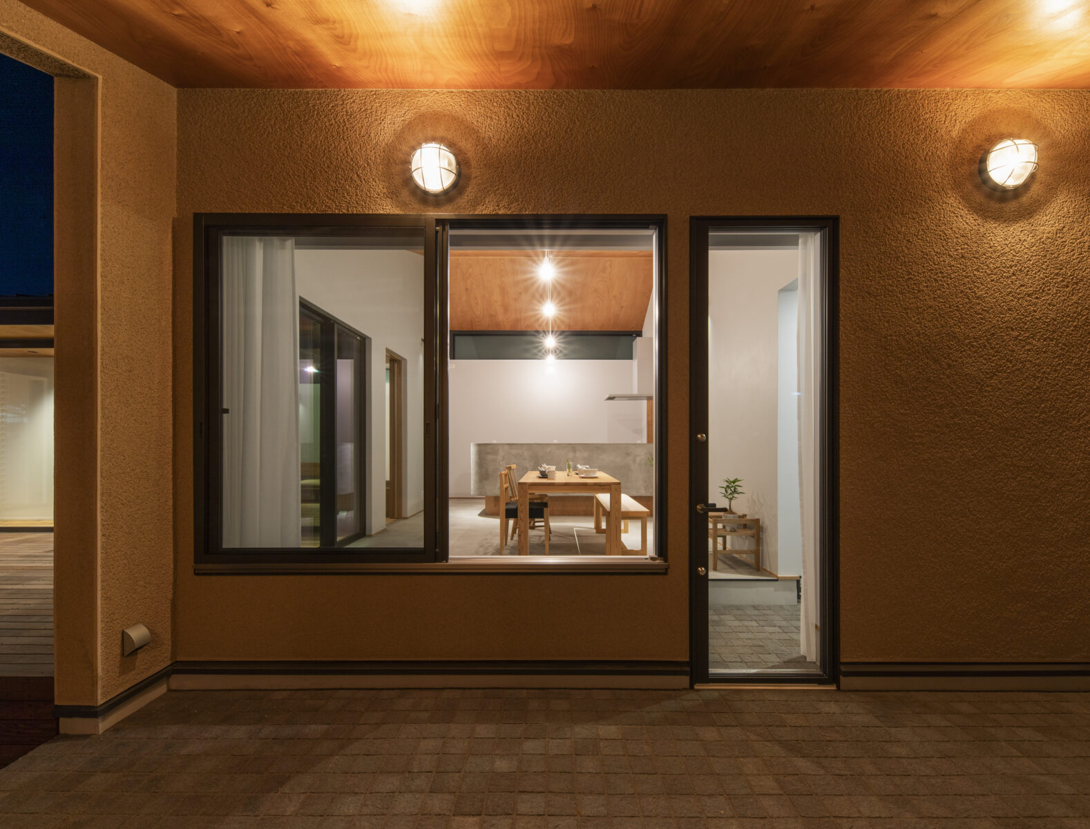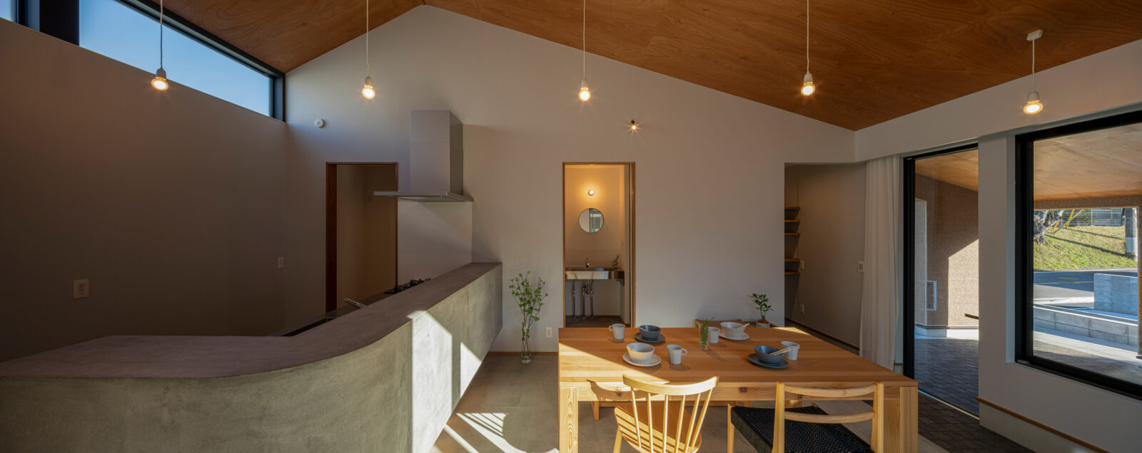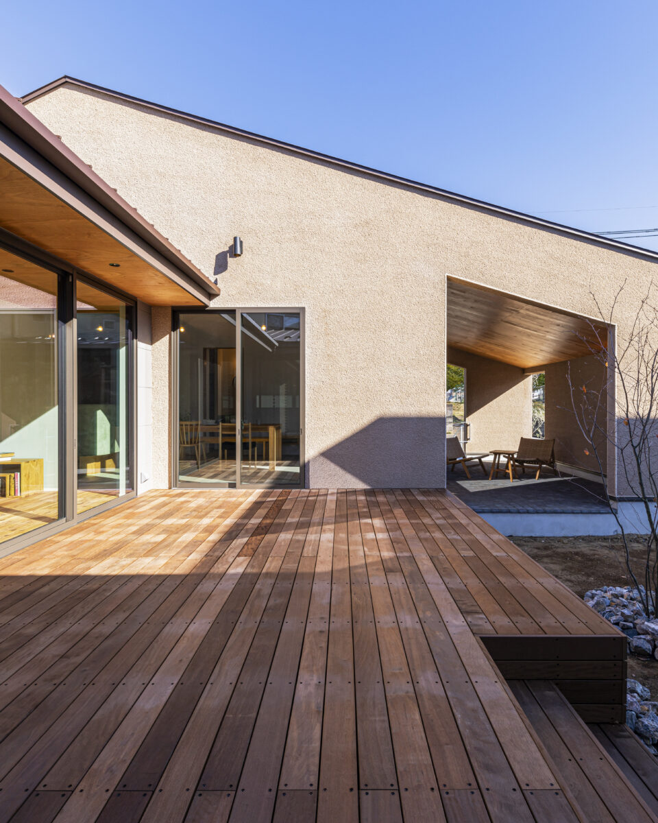 canopy 建築エリア 千葉県 建築年 2024 敷地面積 330.27m² 延床面積 125.87m² 閑静な住宅地に佇む、自然素材の美しさと独特の風合いを楽しめる、そとん壁で仕上げた平屋。 道路よりも高い敷地に位置し、開口部を絞った外壁で覆うことでプライバシーに配慮しました。 中庭を囲うコの字型プランとして、ダイニングキッチンをパブリックゾーン→リビングをセミパブリックゾーン→各居室のプライベートゾーンと奥に行くにつれて分節。 各ゾーンに大きな窓を設けることで、どこからでも L 字型ウッドデッキにアクセスできる回遊性を持つ動線となり、内と外がシームレスにつながる伸びやかな空間としました。 南面に設けたオープンな半屋外の土間は、建築内外のバッファーゾーン ( 閾空間 ) として計画し、ダイニングとを分節したり、或いは一体的な利用ができるような可変的な空間としました。 ダイニングキッチンの高さ最大 4m の勾配天井は、平屋だからできる縦空間の圧倒的な開放感を与えてくれます。 造作キッチンの腰壁と床をモルタルで仕上げ、カッチリとしながらもアクセントにR形状の要素を加えて柔らかい印象に。 リビング・ホール・各居室を、やわらかく足ざわりが気持ちいい無垢の杉板フローリングで仕上げることで、空間の連続性を高め開放感を感じられます。 ラワン、モルタル、PORTER’S PAINTS の塗装など、異素材が調和を保ち、暮らしに楽しさをもたらしてくれる住宅となりました。