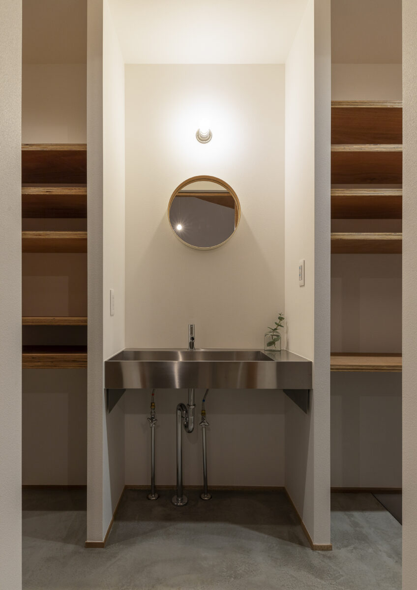 造作キッチンの腰壁と床をモルタルで仕上げ、カッチリとしながらもアクセントにR形状の要素を加えて柔らかい印象に。