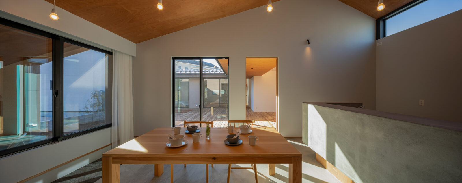 中庭を囲うコの字型プランとして、ダイニングキッチンをパブリックゾーン→リビングをセミパブリックゾーン→各居室のプライベートゾーンと奥に行くにつれて分節。