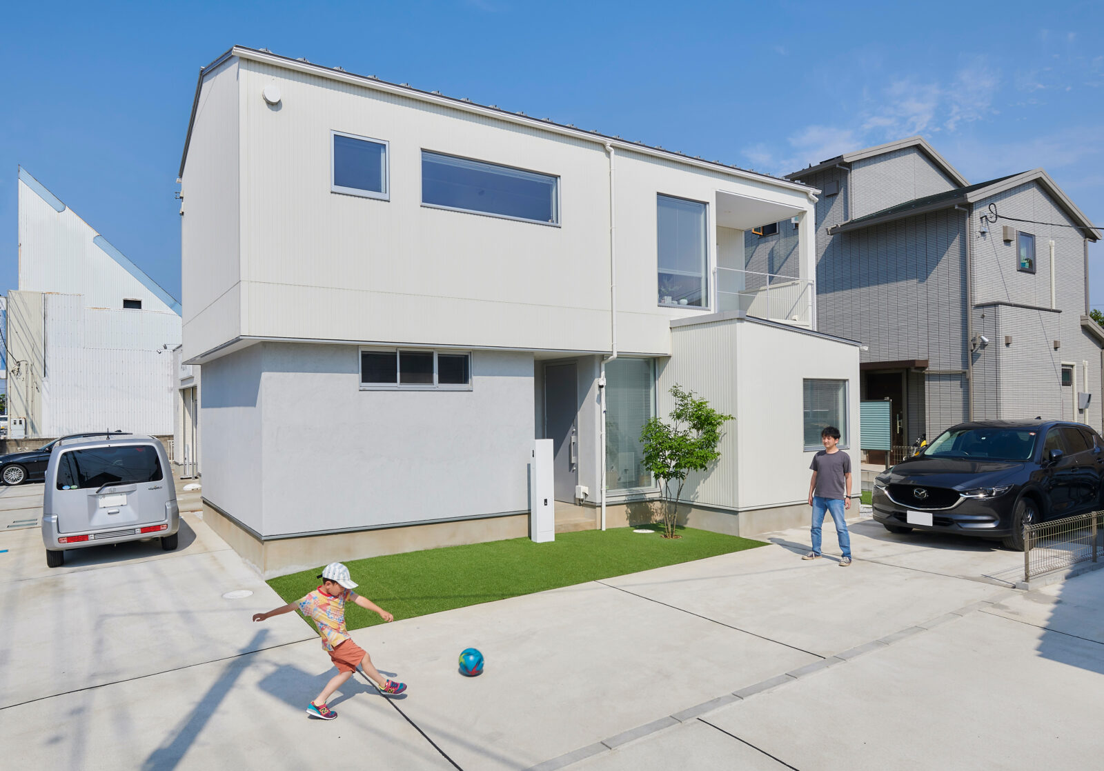 切妻屋根の、白いキャンバスのような外観が特徴的な住宅。