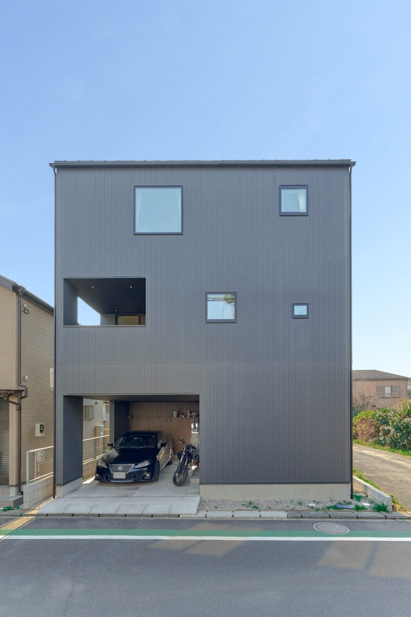 CHALK HOUSE 建築エリア 千葉県 建築年 2018 敷地面積 60.98m² 延床面積 117.35m² 都市部の狭小地に計画された3階建て+ペントハウスの住宅。 4層吹き抜けとなる階段の踊り場に、ワークスペース等の用途を与え、 ビルトインガレージ+屋上テラスを含め計7層による空間構成に。 階段を中心に縦のフロア同士が繋がり、家全体に一体感と遊び心を加えています。 床材にはラスティックオーク×ヘリンボーンを使用。 ブラックスチールとのコントラストが空間を引き締め個性を高めます。 夏の花火大会を望みたいとの要望から設けられた屋上テラス。 都市の中でプライバシー性を高めながら開放感のある外の空間を創出しました。