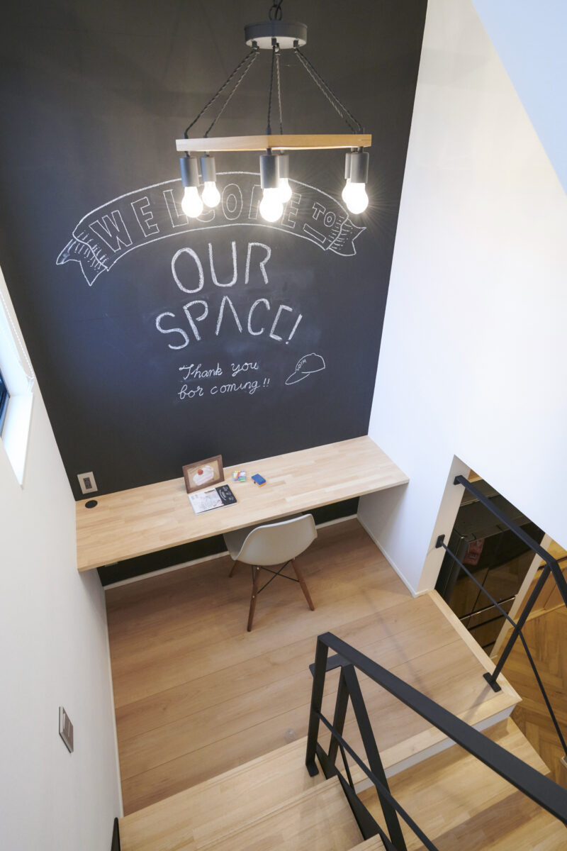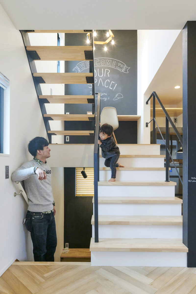 階段を中心に縦のフロア同士が繋がり、家全体に一体感と遊び心を加えています。