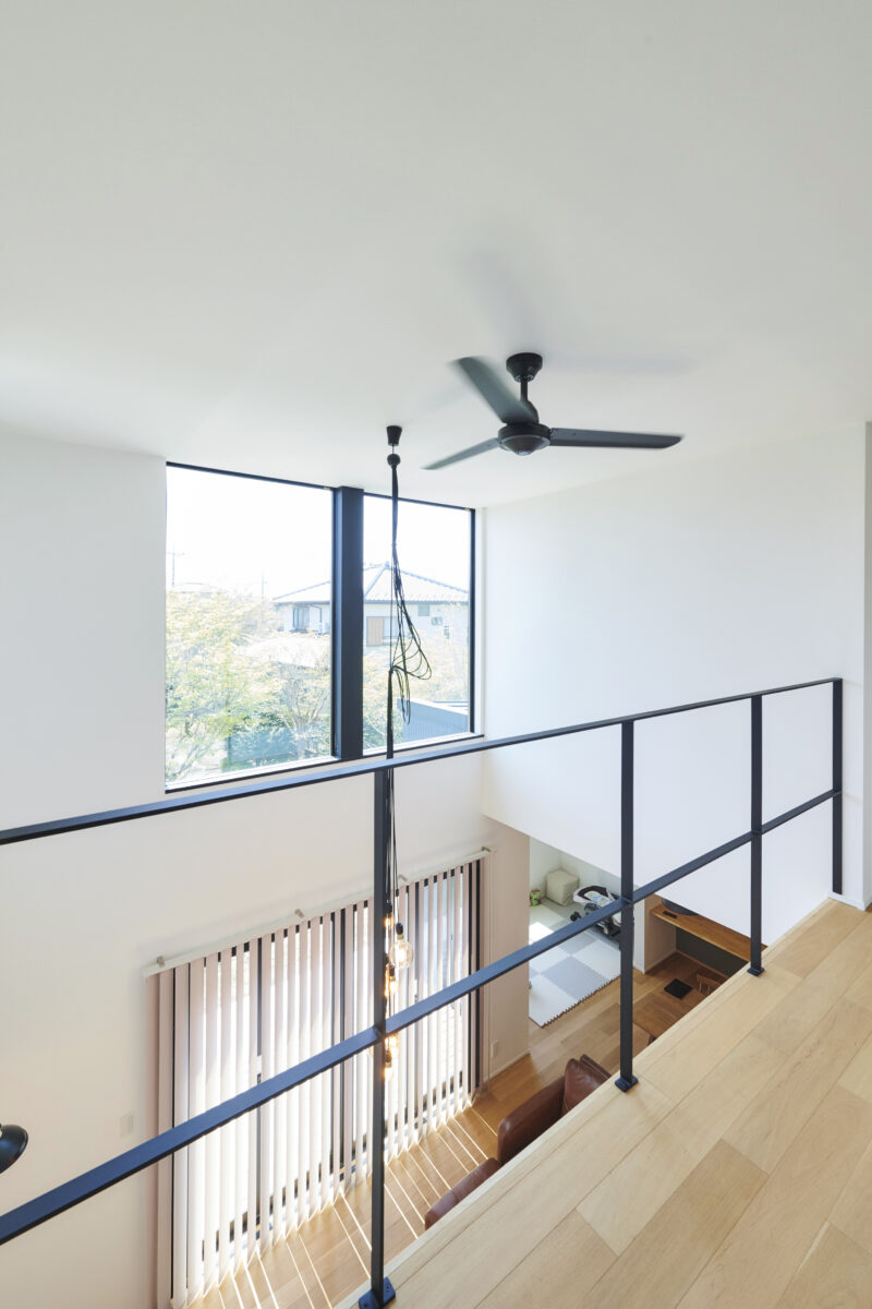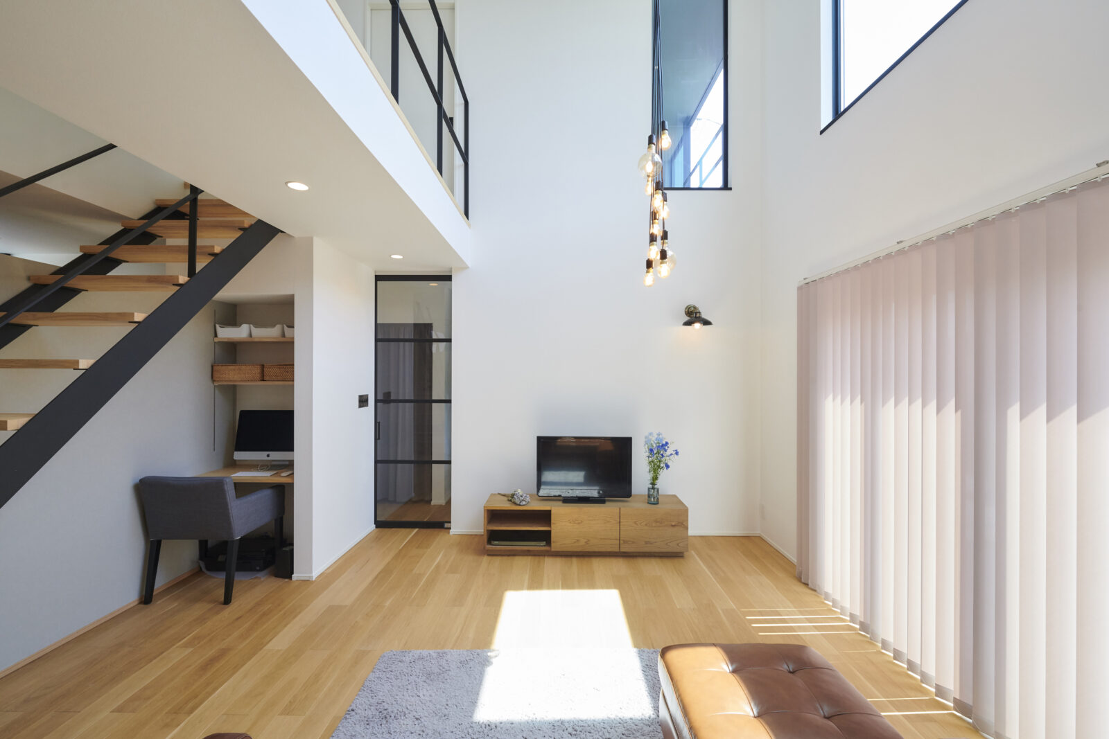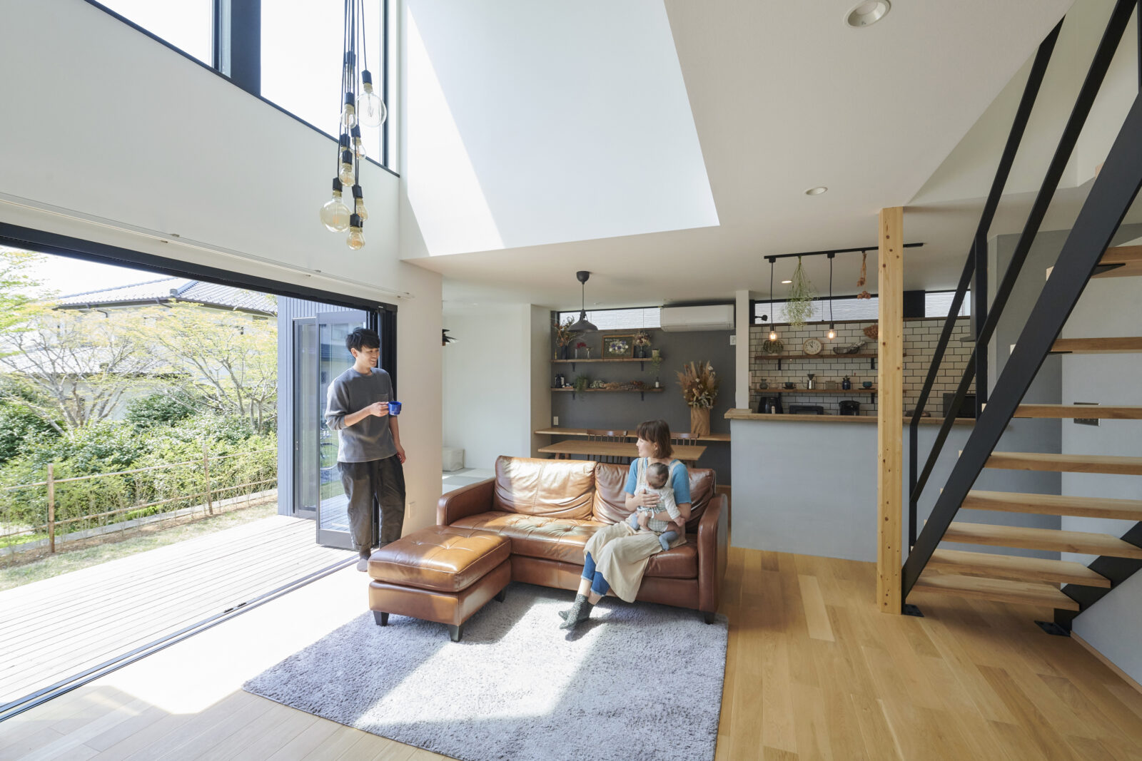 吹き抜けと重ねてリビングに設けた大開口からは、