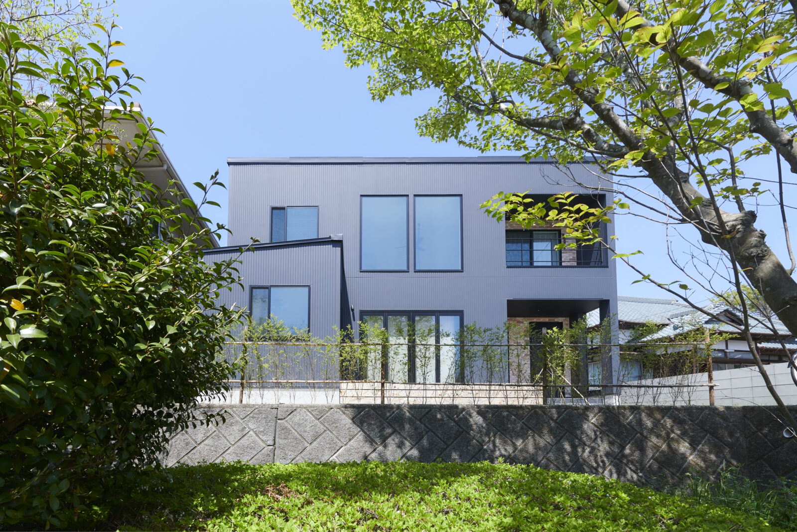 緑に囲まれた閑静な環境に佇む黒い矩形の住宅。