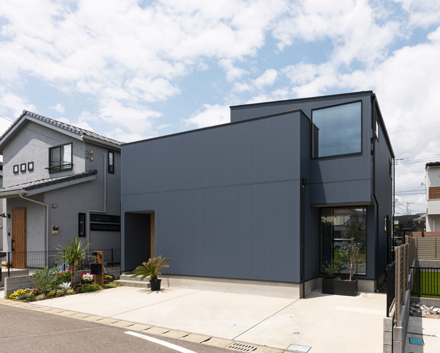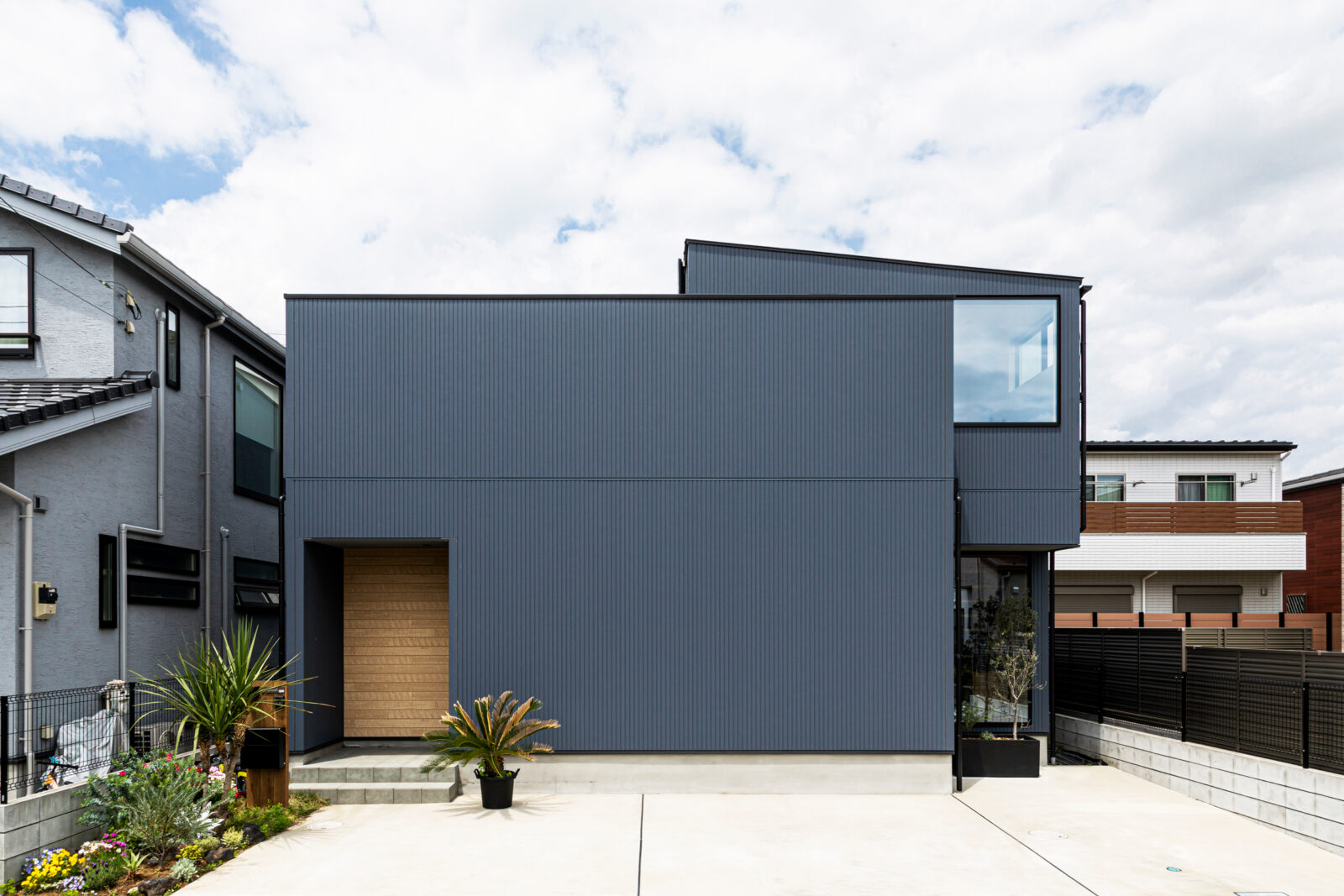 ネイビーを基調に箱型と片流れ屋根の異なる形状が重なった、存在感があるファサード。