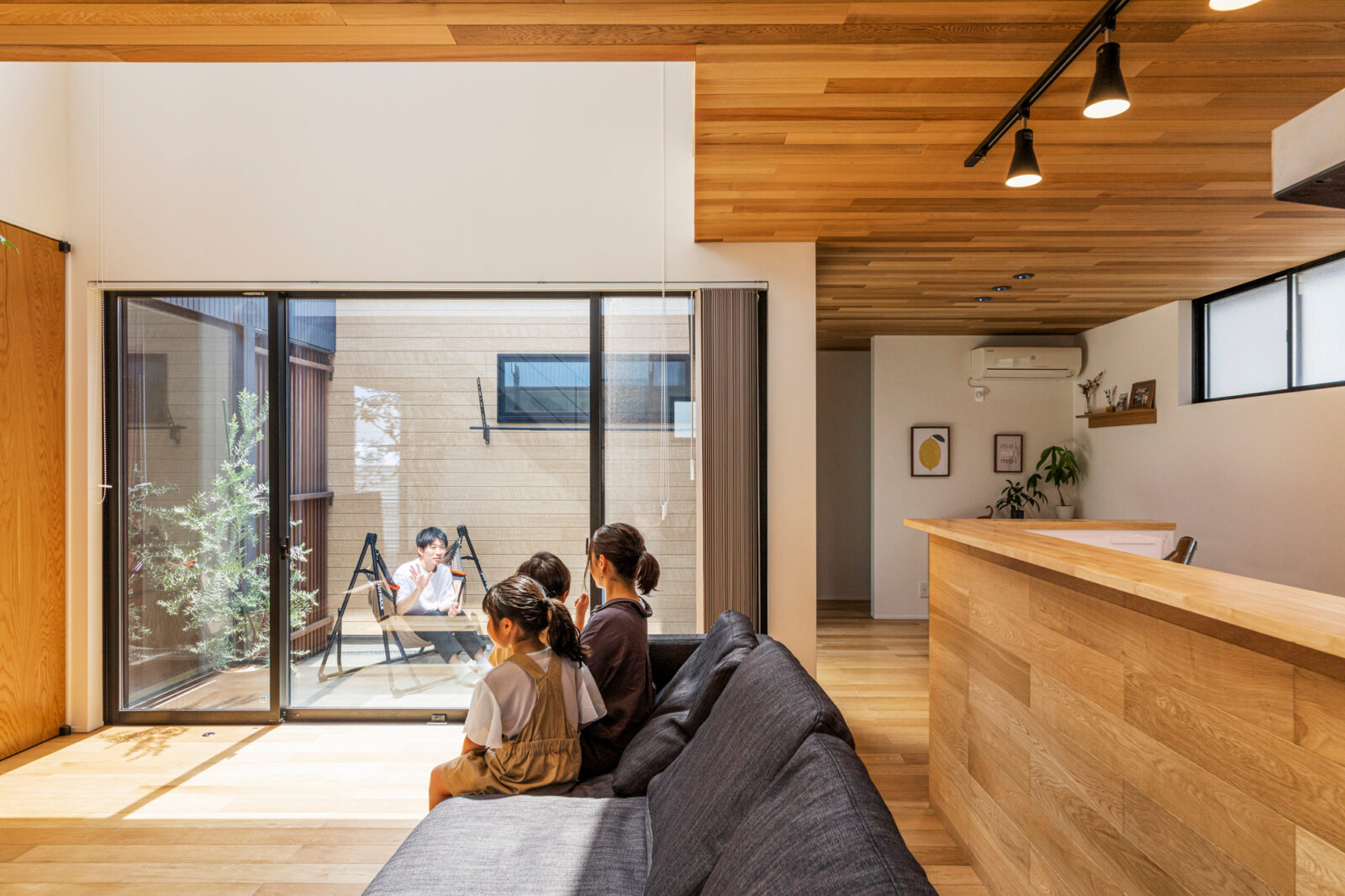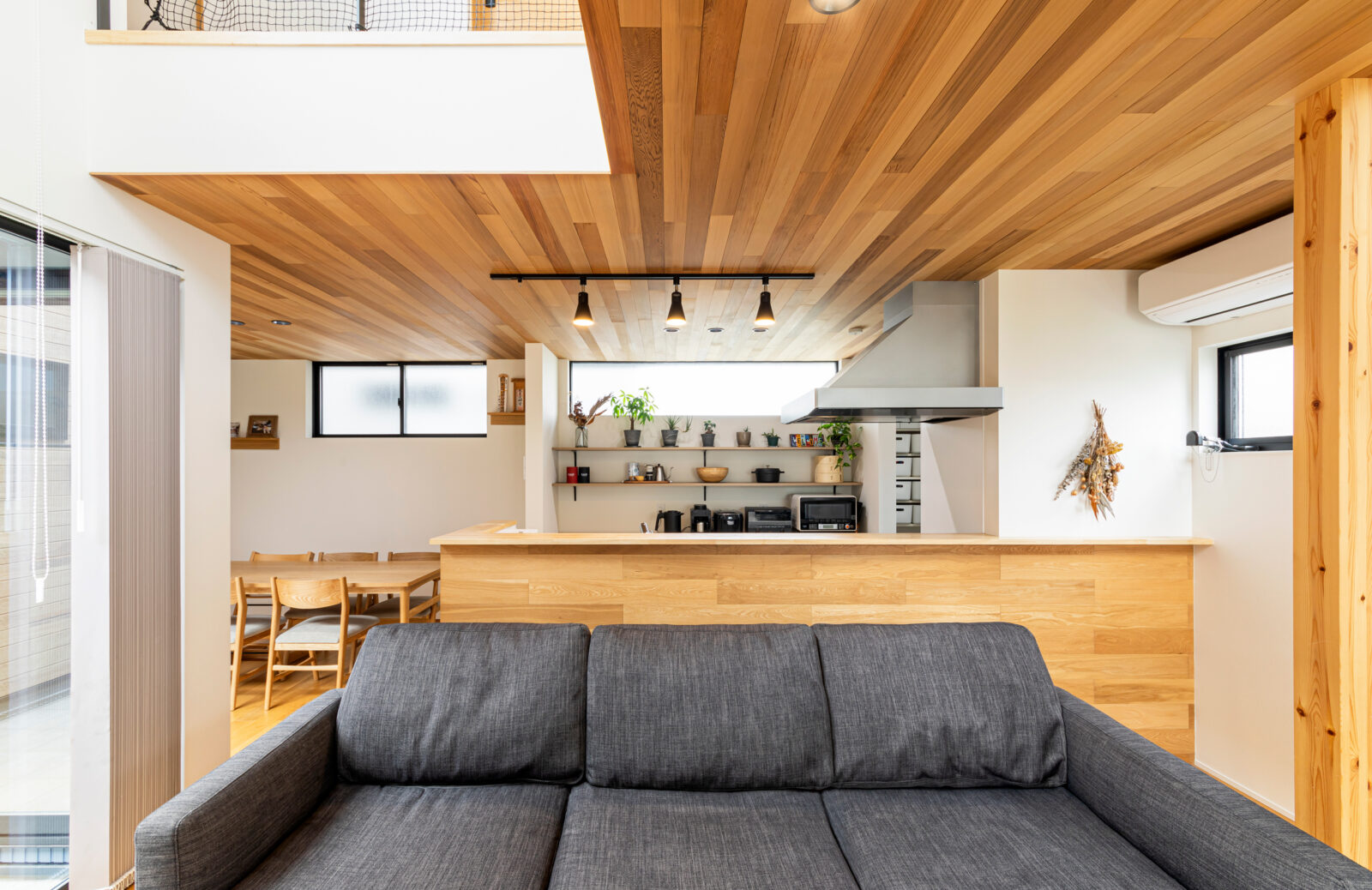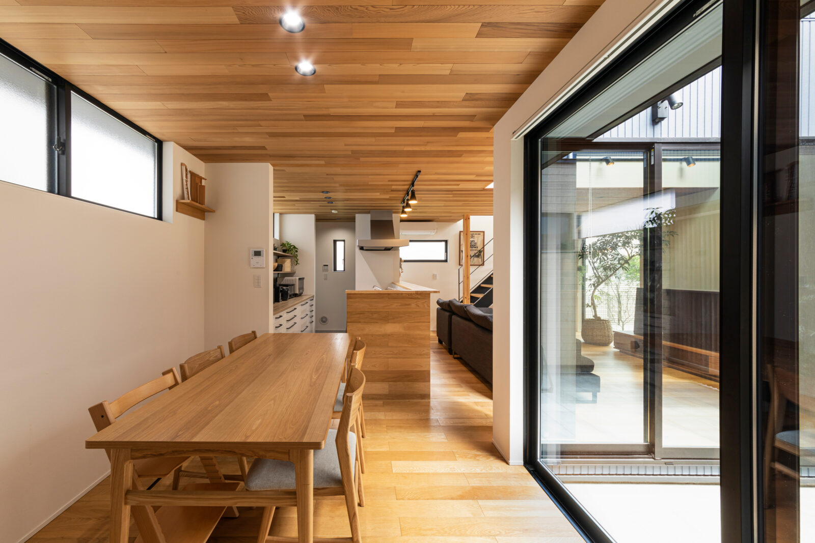 LDKの天井一面に連なったレッドシダーは、吹抜との対比により立体的で奥行を感じさせます。