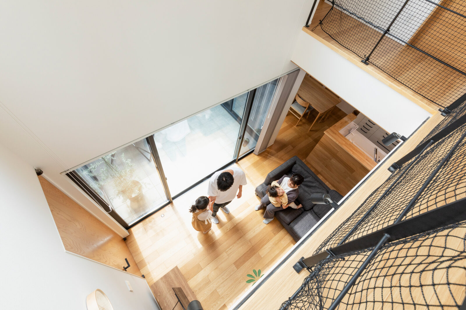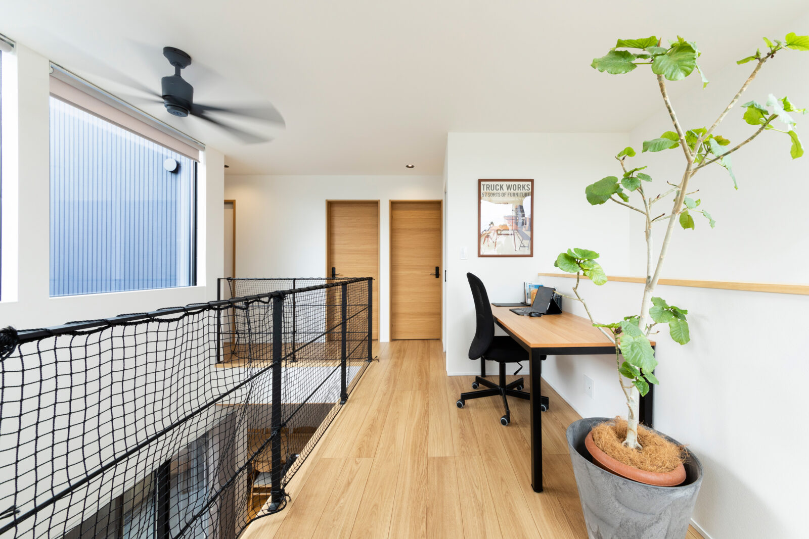 吹抜けでつながった2階には、本棚とワークスペースを設け、日常も仕事も充実させる空間となりました。