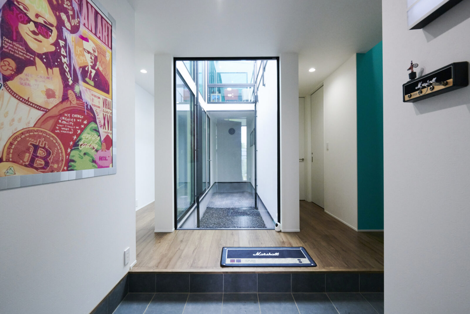 Diner 建築エリア 千葉県 建築年 2021 敷地面積 246.36m² 延床面積 146.57m² 道路側から開口を一切設けず、一見すると用途が分からないファサード。 内部に入ると一転して、真正面にガラス張りの中庭が目の前に現れます。 お施主様の趣味を詰め込んだLDKは、ビビットカラーの壁紙と一面に広がるチェッカー柄のフロア。 ネオン菅の雰囲気を味わえるLEDの間接照明により、アメリカンダイナーやDJブースのようにドラマチックに照らします。 敷地東側に広がる緑を、最大限に取り込むLDKの連続した開口からしっかりと採光を確保。 スキップフロアを利用した階段下の玄関収納、各居室の壁紙など細部までこだわっております。 お施主様の趣味とイメージを最大限に取り入れた、唯一無二のお住まいです。