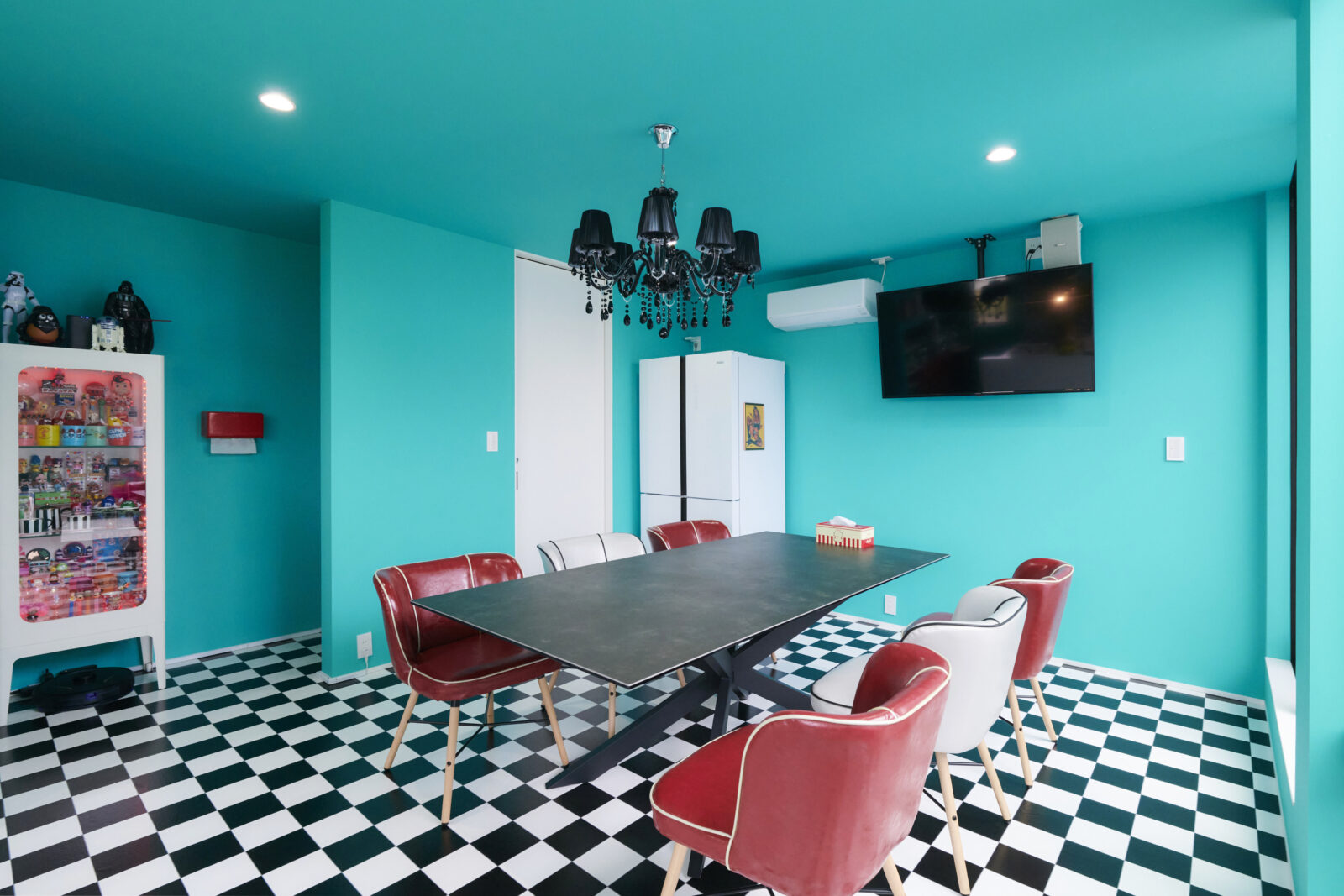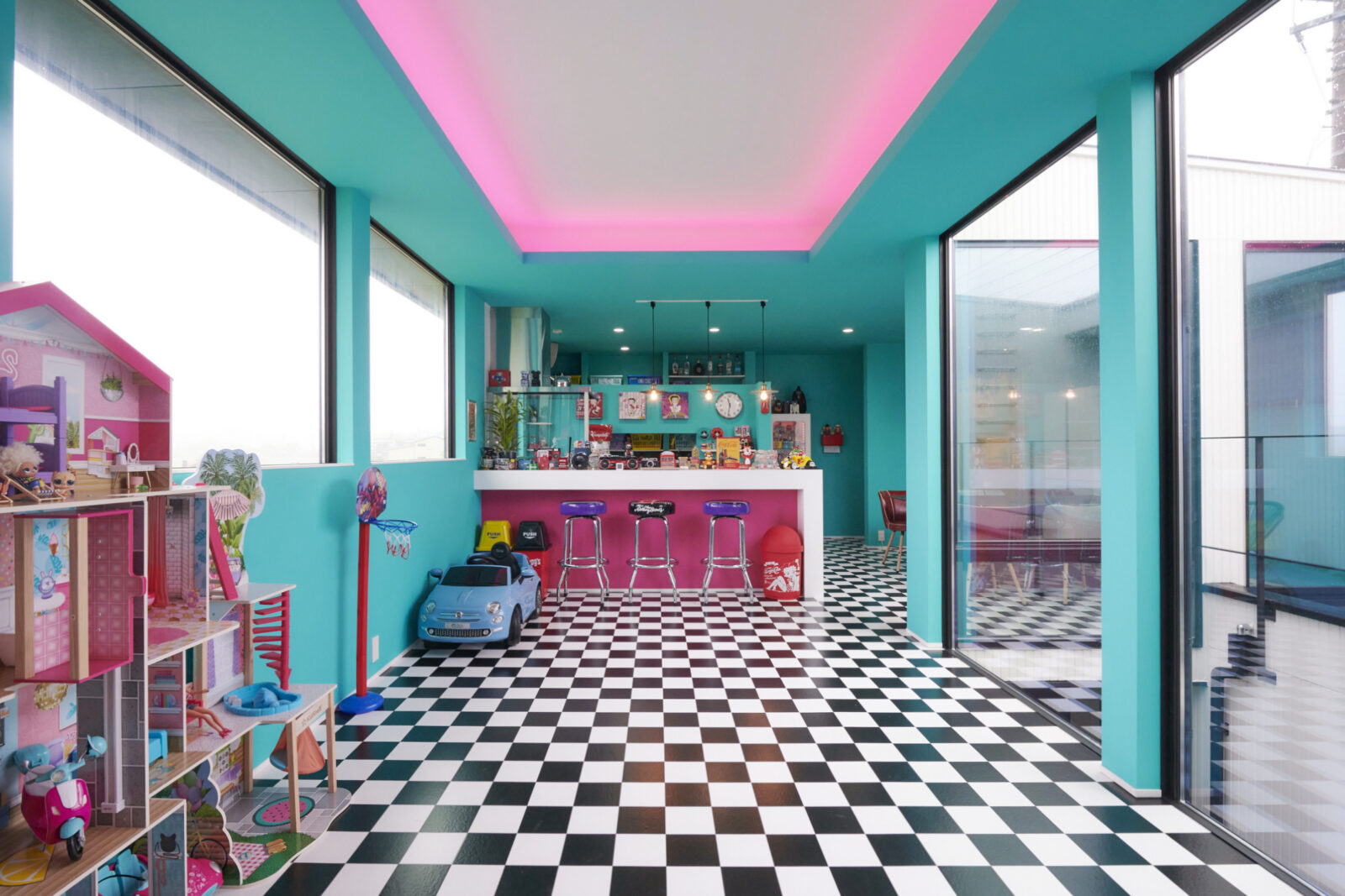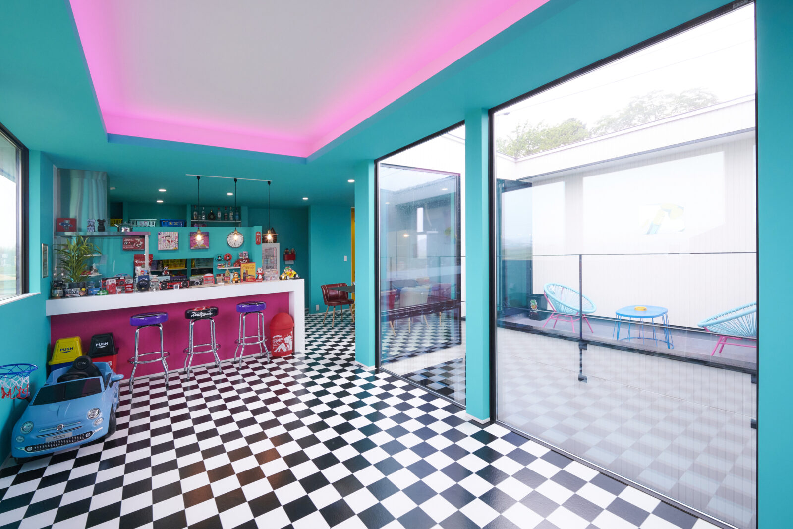 お施主様の趣味を詰め込んだLDKは、ビビットカラーの壁紙と一面に広がるチェッカー柄のフロア。