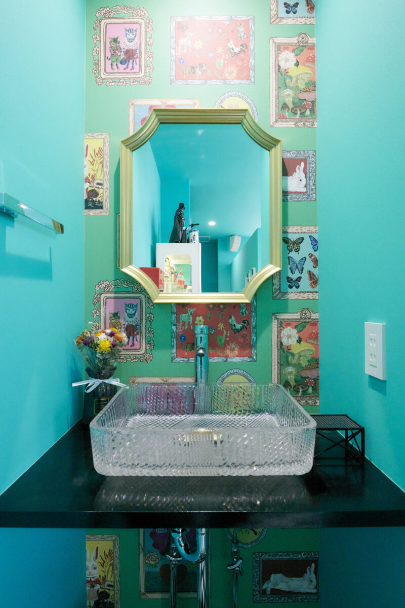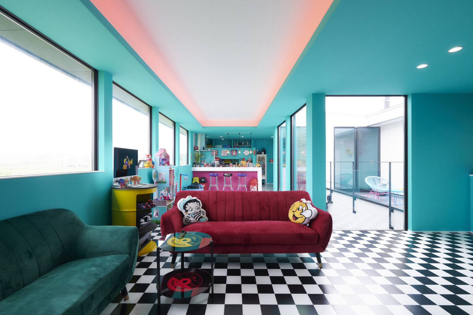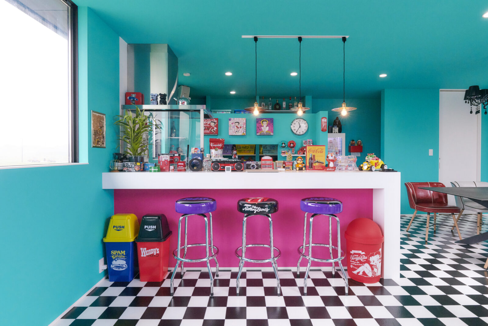 お施主様の趣味を詰め込んだLDKは、ビビットカラーの壁紙と一面に広がるチェッカー柄のフロア。