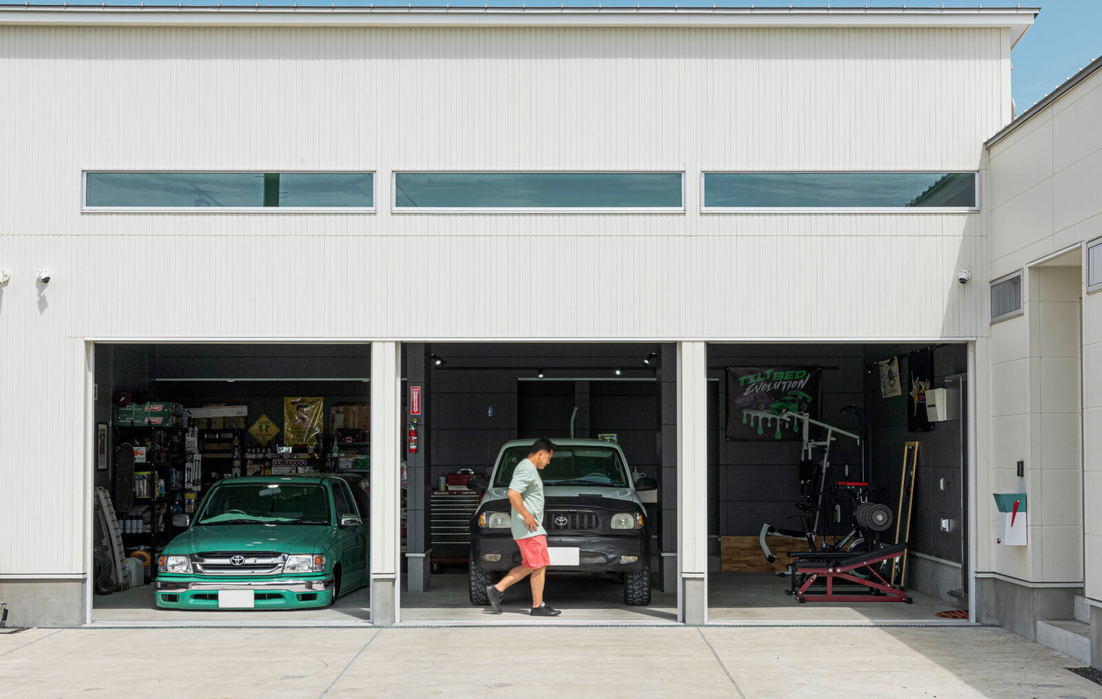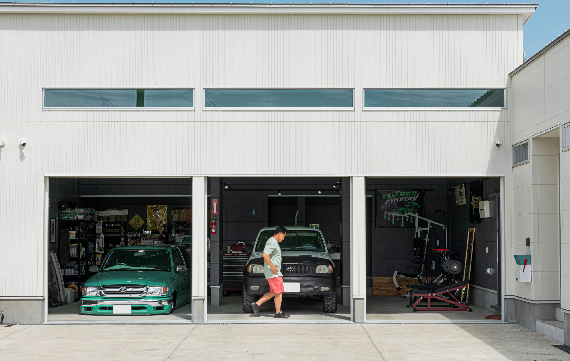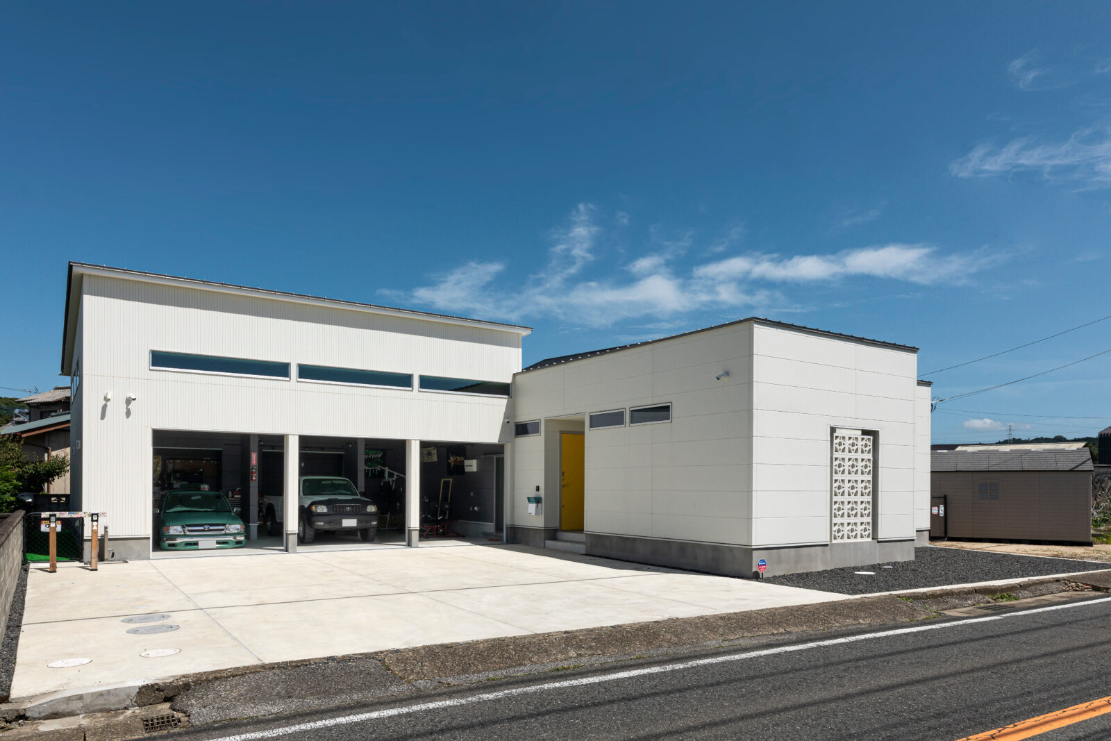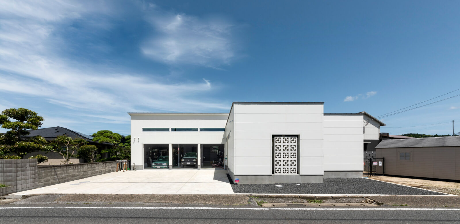 FLAT BASE 建築エリア 千葉県 建築年 2022 敷地面積 376.98m² 延床面積 163.53m² 沖縄の米軍住宅をイメージを取り入れた、ミッドセンチュリーの平屋。 外壁の一部に沖縄生まれの「花ブロック」を使用し、独特の表情があり色合いを白に統一。個性的な外観を作り出しています。 車が好きなお施主様のために、車がたくさん駐車出来るスペースと、車3台入庫しても余裕がある大きなガレージを設けました。 ガレージスペース天井にはミントグリーンの塗装で、レトロアメリカなカフェのような空間に演出しました。 硬質感が強調されたフロアタイルとウォールナット調のインテリアで統一したリビングは、ショップのような空間となっています。 愛車と共に歩めるように、Garage→Entrance → SC → Pantry→LDKと回遊できるように設計。 お施主様の車愛を感じられるお住まいとなりました。