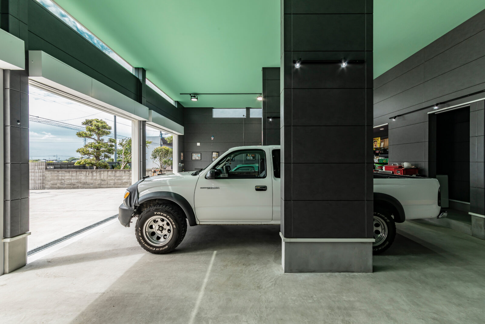 ガレージスペース天井にはミントグリーンの塗装で、レトロアメリカなカフェのような空間に演出しました。