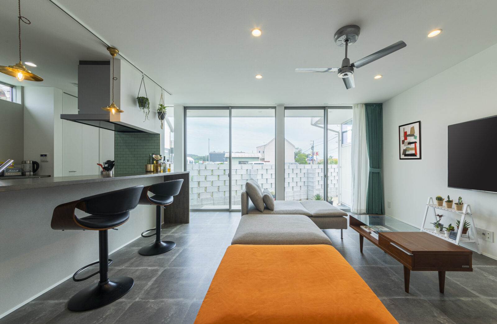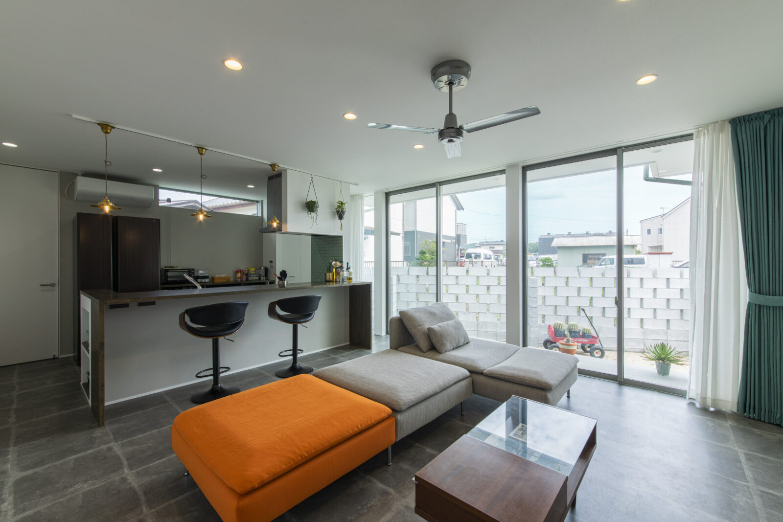 硬質感が強調されたフロアタイルとウォールナット調のインテリアで統一したリビングは、ショップのような空間となっています。
