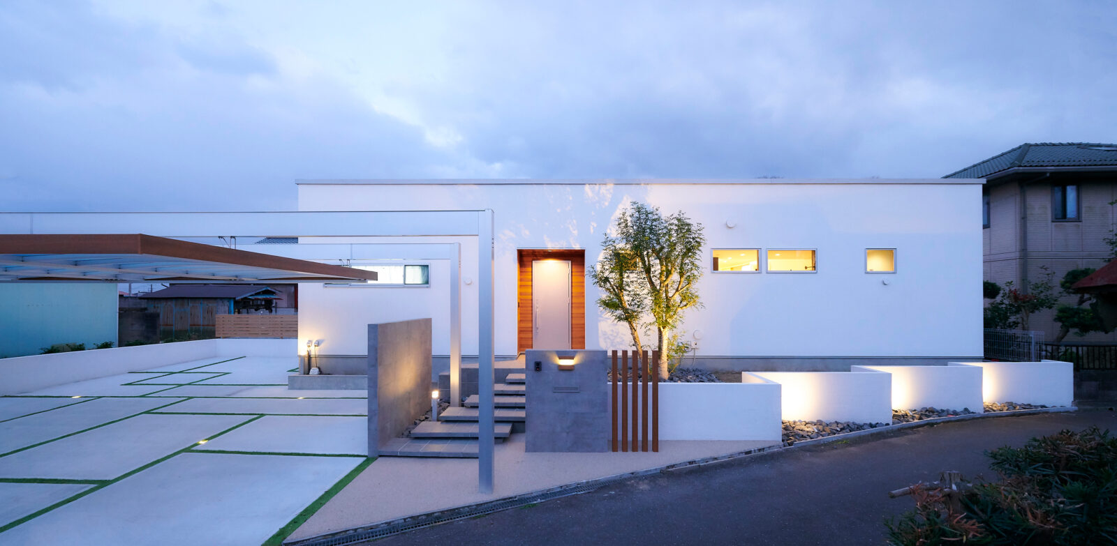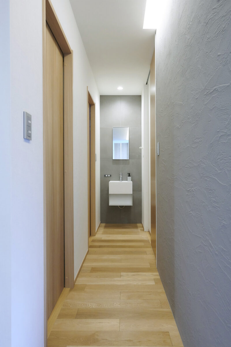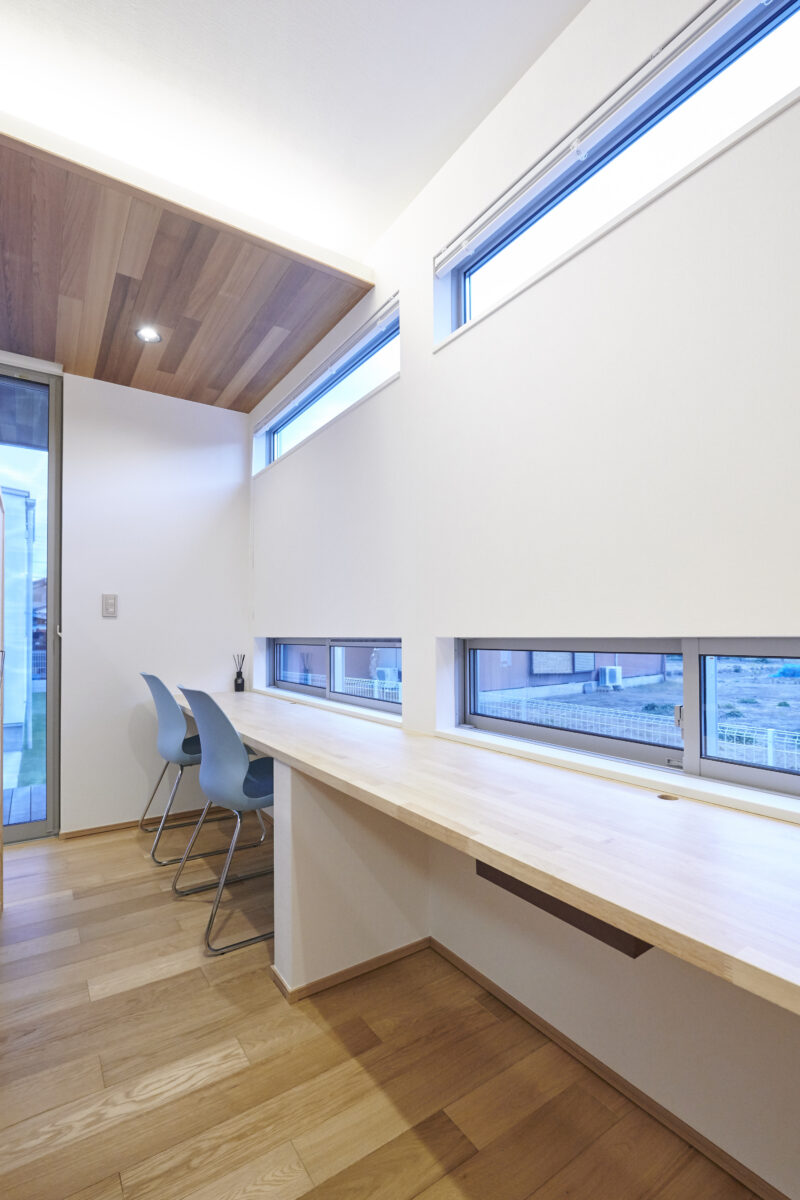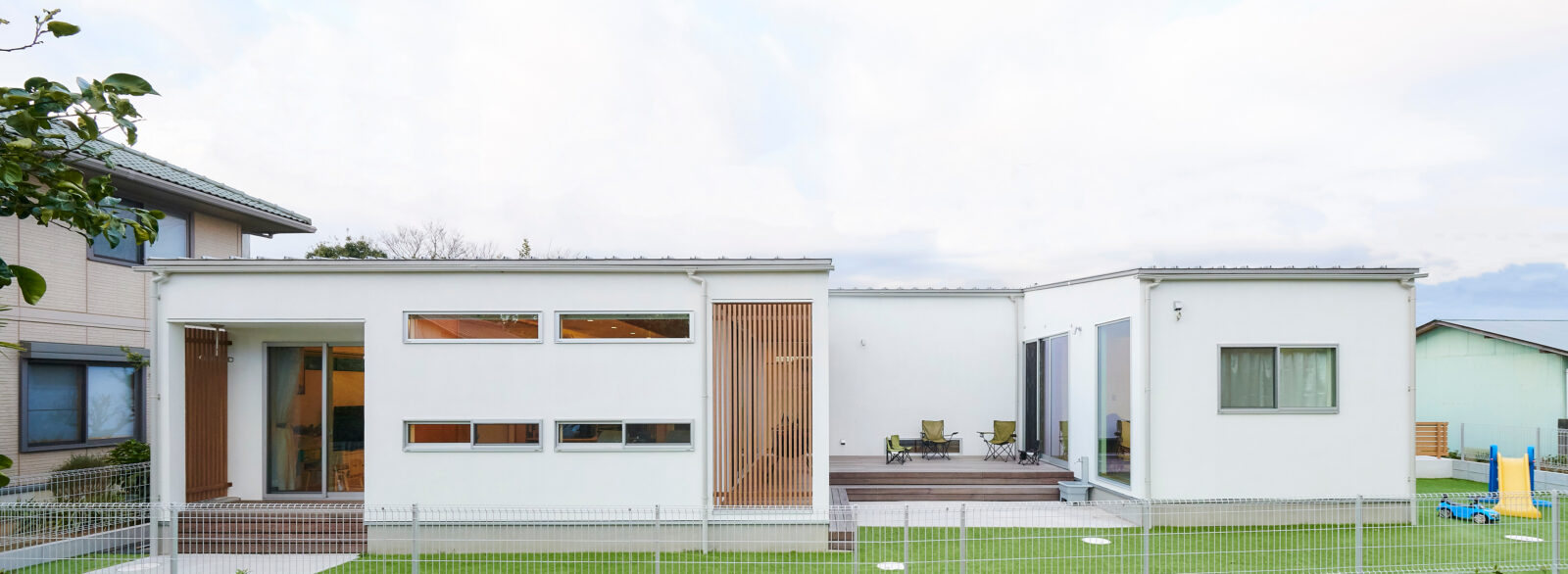 FLAT COURT 建築エリア 千葉県 建築年 2020 敷地面積 404.96m² 延床面積 112.84m² シンプルな塗り壁の外観が特徴的な住宅。 建物の中心に中庭を配置し、中庭を元にプライベートスペース、パブリックスペースを分けています。 コの字型の間取りとし、居室通しが中庭を介してつながりを持ち、どこにいても家族の気配が感じることが出来ます。 また、中庭は道路や隣地からの視線を制限し、プライバシーの配慮も考慮しつつ、 軒を大きく出し、同素材の天井材を使用することで、建物内外のつながりをより強調し、広がりのある空間を実現しました。