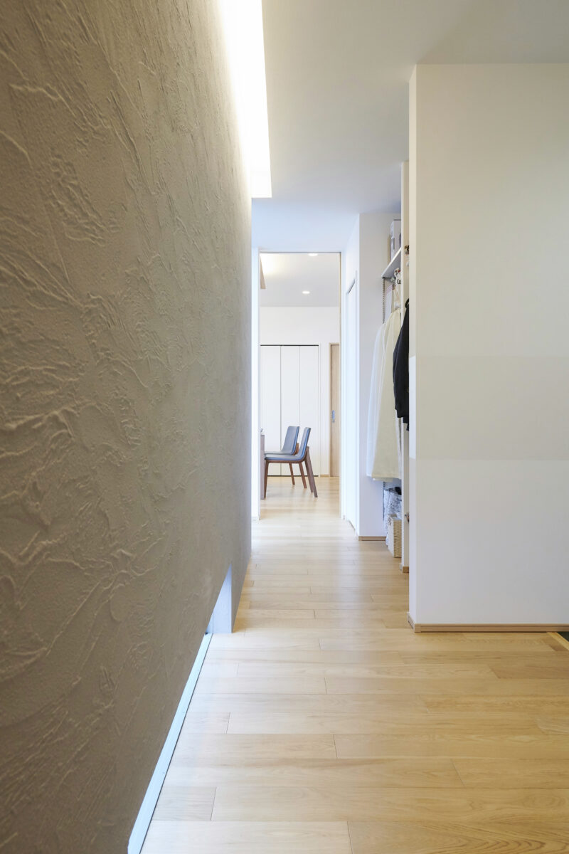シンプルな塗り壁の外観が特徴的な住宅。