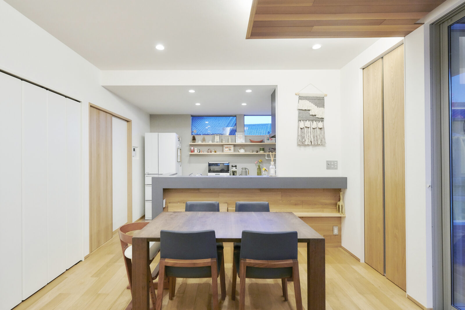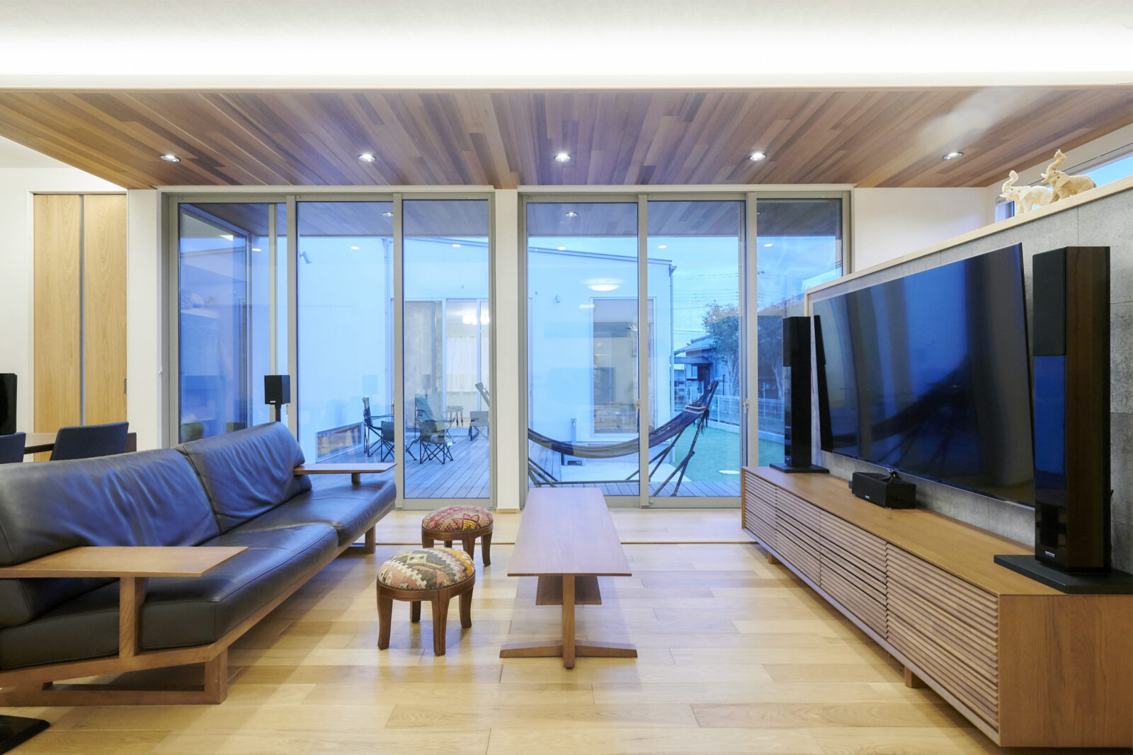 軒を大きく出し、同素材の天井材を使用することで、建物内外のつながりをより強調し、広がりのある空間を実現しました。