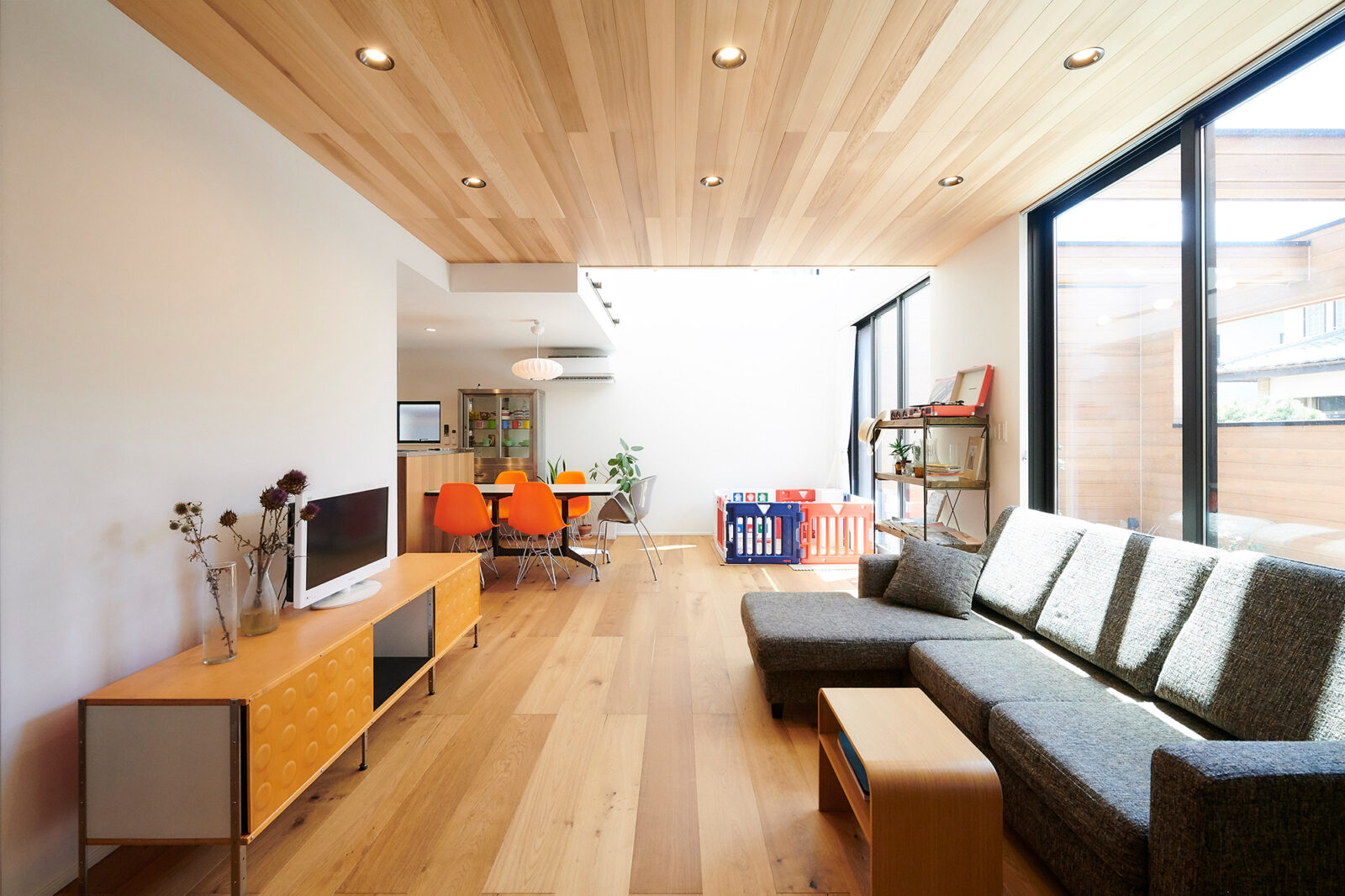 Green Cave 建築エリア 千葉県 建築年 2019 敷地面積 148.29m² 延床面積 101.02m² 都市部に計画されたコートハウス。 密集した住宅街に建つこの住宅を計画する際、周辺地域や近隣住民との距離感を重視しました。 道路境界からオフセットして側壁を設け、その内側に庭を配することで 落ち着きのある住空間を実現しました。 外部の騒音や視線からは守られつつも、光や風を程よく取り込む、 緑と木塀に囲まれた庭=バッファーゾーンが住宅と街の程良い距離感を演出しています。