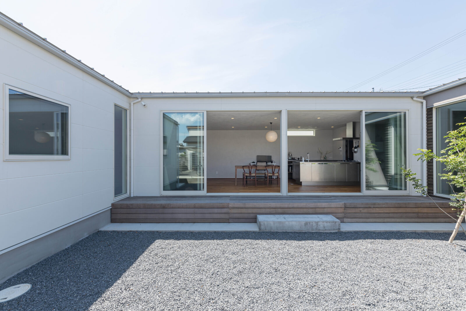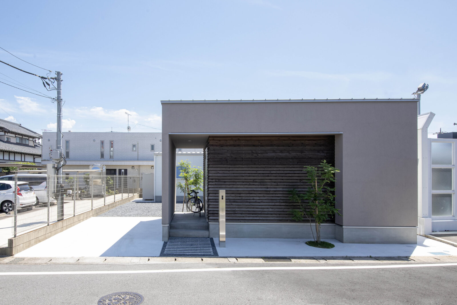 グレージュの塗り壁に屋久島地杉がアクセントになっているコの字型の平屋。
