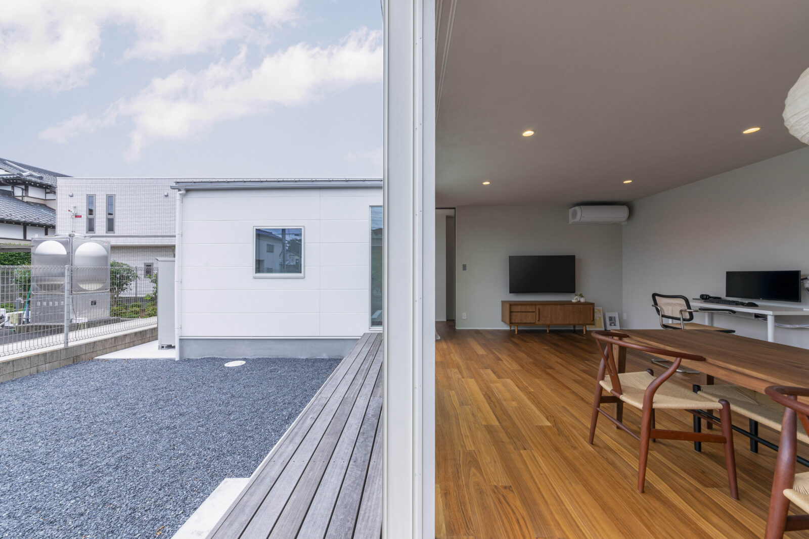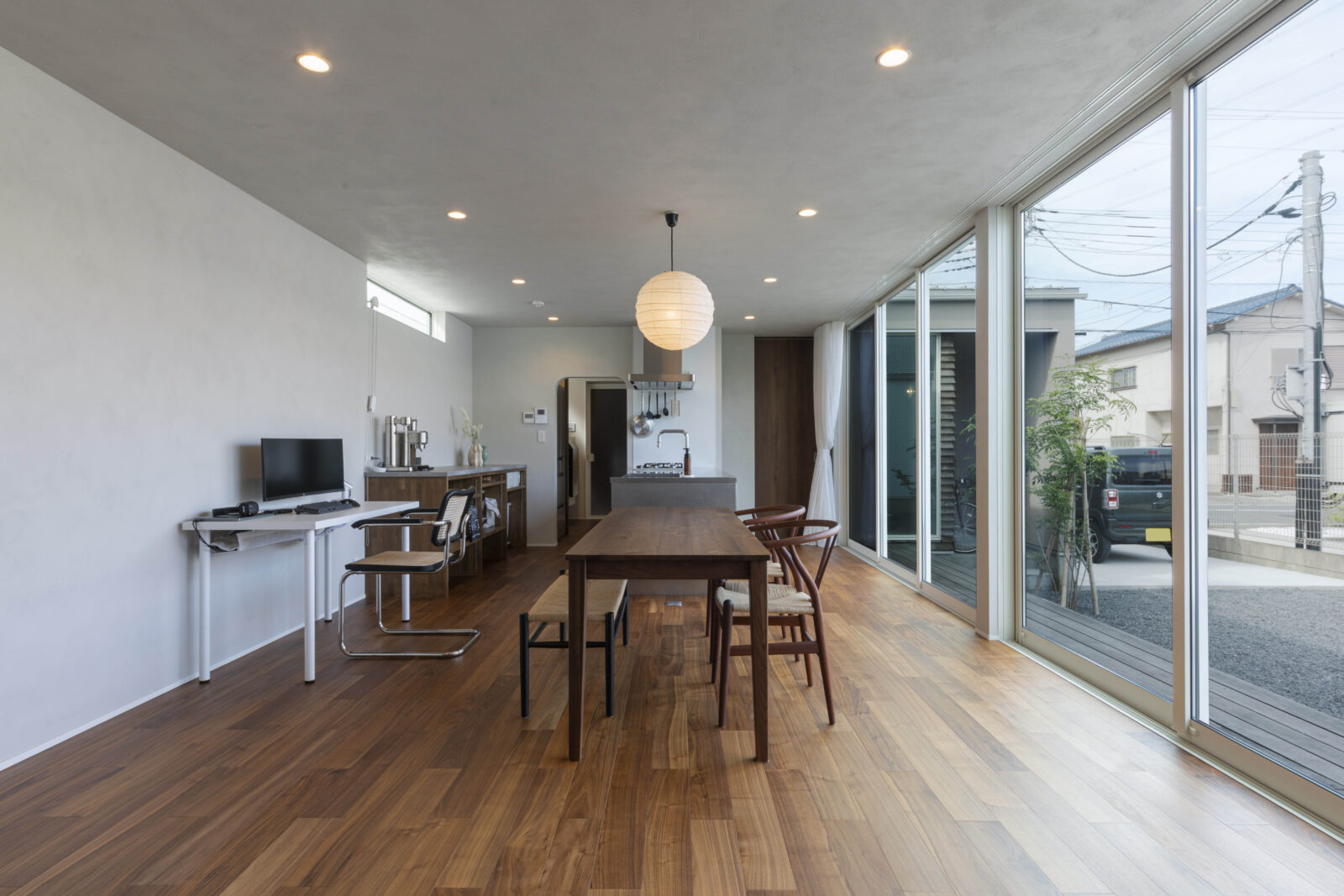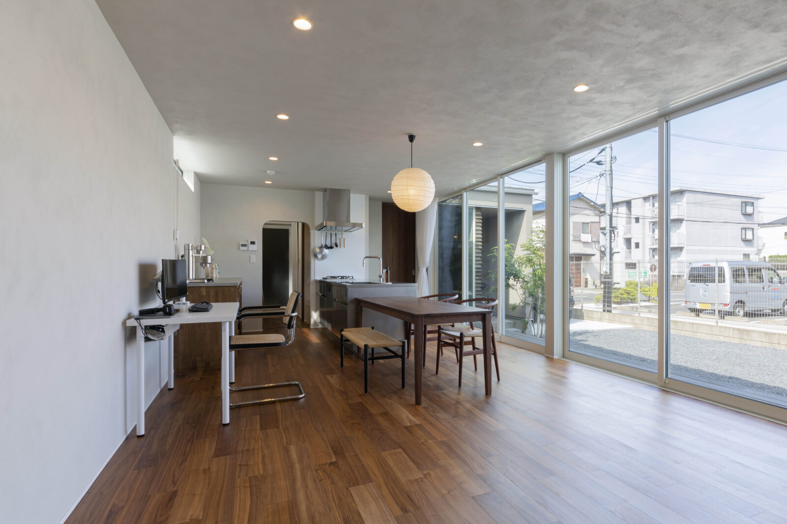 FIX窓越しからは中庭を取り入れ、外部空間と内部空間が混じり合い、開放感のある空間に。