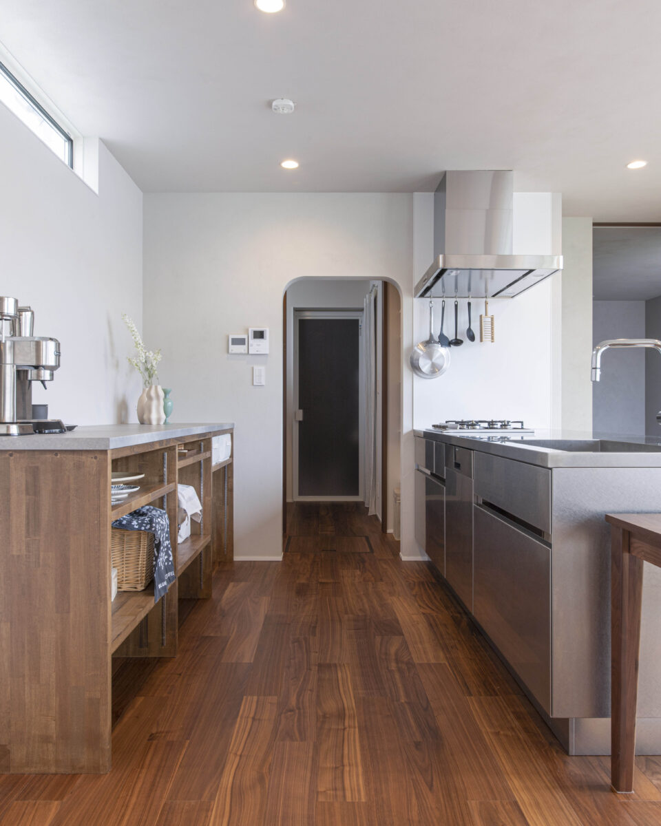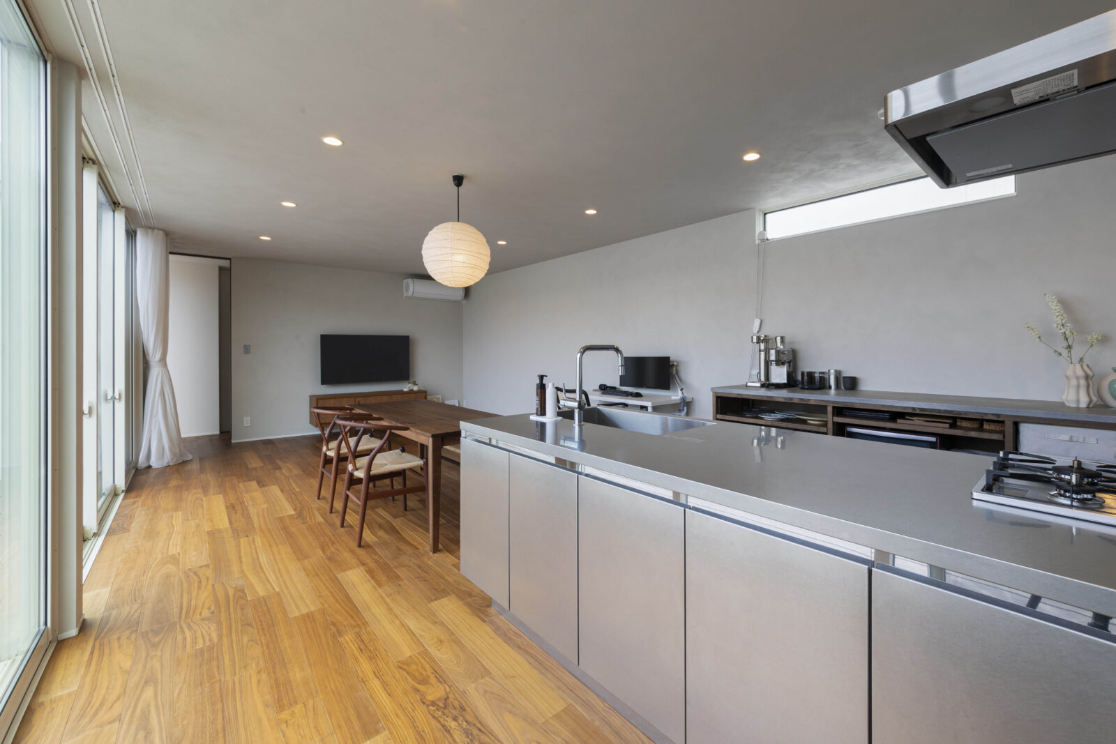 ステンレスを全面に採用したキッチンは洗練された直線的なデザインで高級感があります。