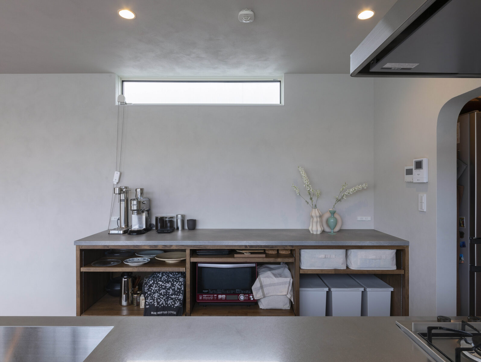 Greige 建築エリア 千葉県 建築年 2022 敷地面積 209.63m² 延床面積 86.18m² グレージュの塗り壁に屋久島地杉がアクセントになっているコの字型の平屋。 LDK・エントランス・サニタリーを壁から天井一面にPORTER’S PAINTSで仕上げ、反射した光の表情や陰影を表現した素材感のある空間となっています。 玄関ポーチは金鏝仕上げのモルタル、玄関ホールはフレキシブルボードで仕上げグレーカラーで統一しています。 FIX窓越しからは中庭を取り入れ、外部空間と内部空間が混じり合い、開放感のある空間に。 ステンレスを全面に採用したキッチンは洗練された直線的なデザインで高級感があります。 お施主様のセンスがひかるインテリアでまとめあげられた室内空間は、カッチリとしたマテリアルとアール壁のバランス、外部からの自然光や木のあたたかみが美しく調和したお住まいになりました。