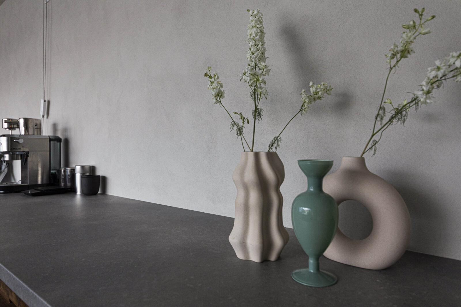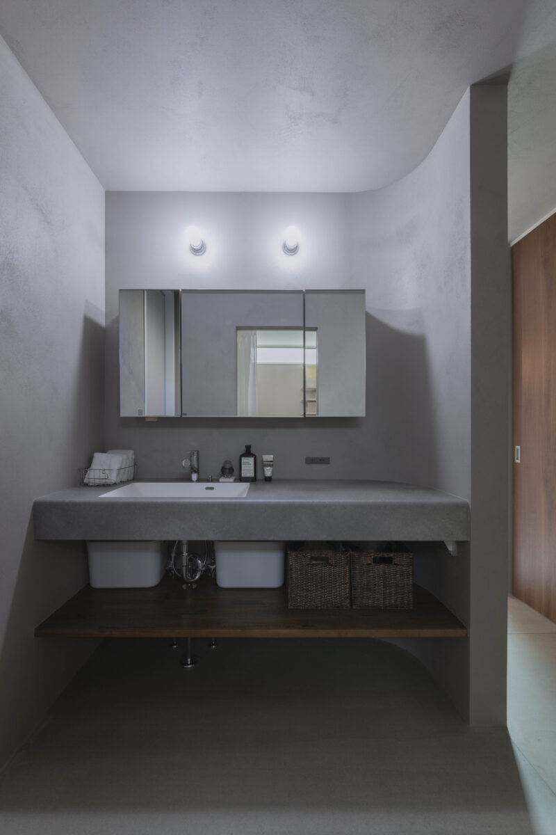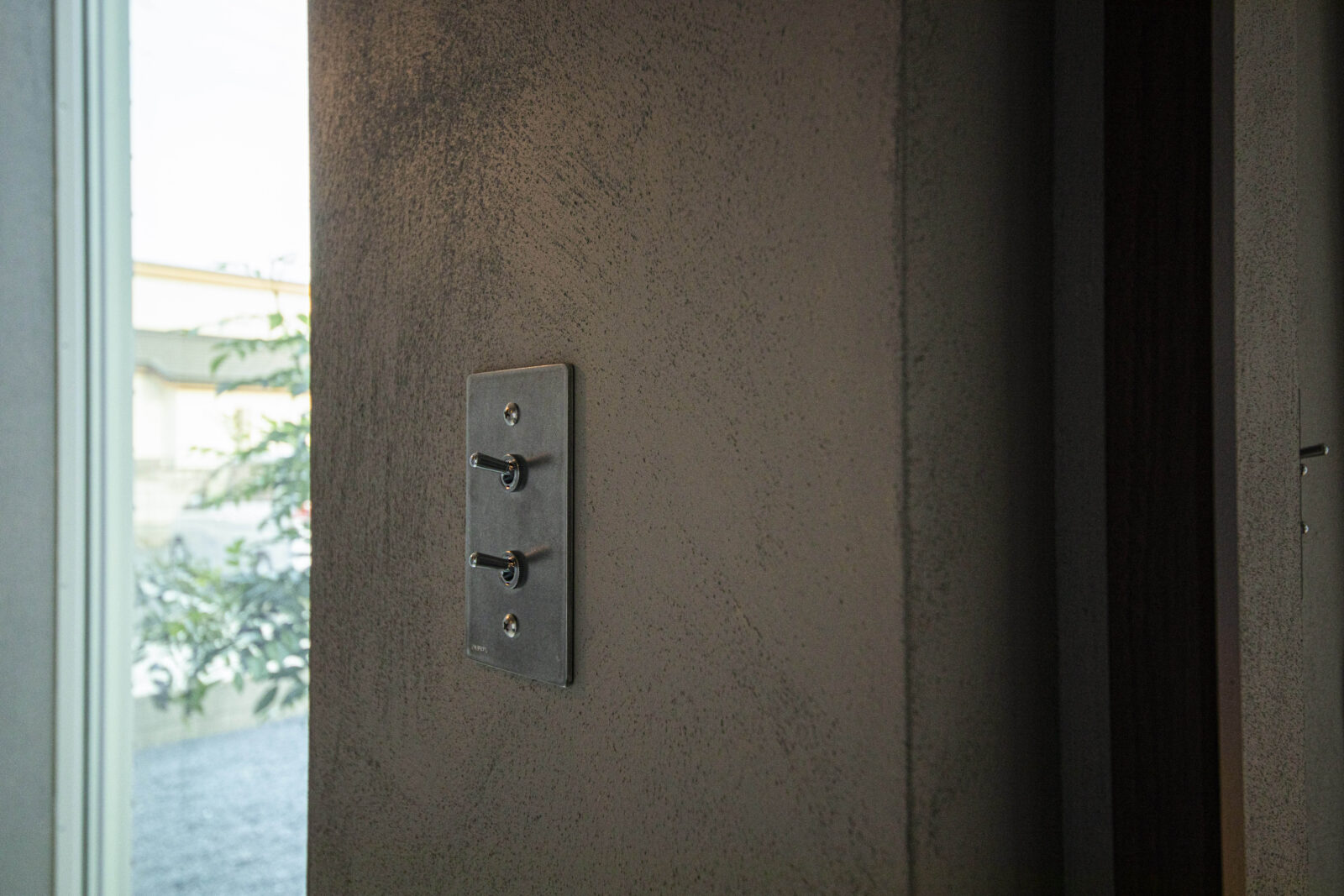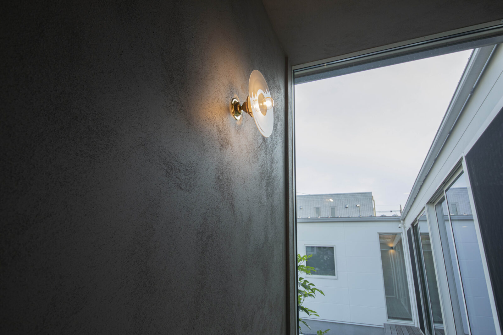 LDK・エントランス・サニタリーを壁から天井一面にPORTER’S PAINTSで仕上げ、反射した光の表情や陰影を表現した素材感のある空間となっています。