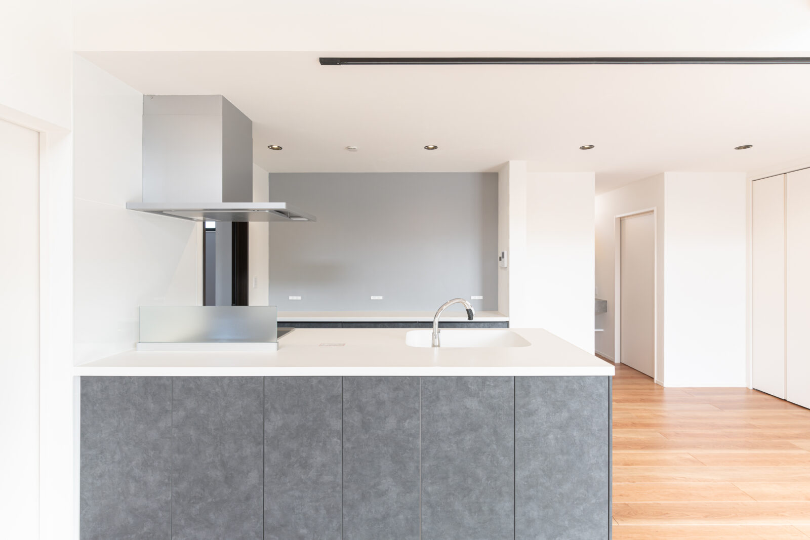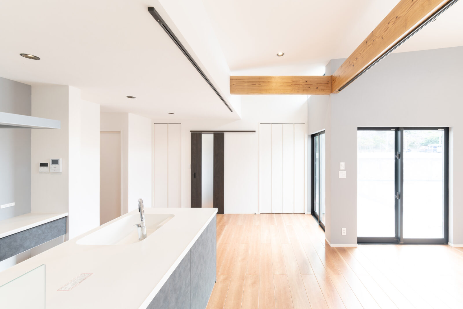 Integration House 建築エリア 沖縄県沖縄市 建築年 2023 敷地面積 132.30m² 延床面積 106.82m² -可変的な平家住宅- 雁行した外観が特徴的な平家住宅。 外壁はシンプルなフラットサイディングに、木目調のアクセントをあしらいました。 勾配天井のリビングにハイサイド窓を設けることで、外部からの自然光が入る開放的なLDK空間となりました。内壁を漆喰仕上げとしたことで、空間に表情が生まれます。 南側にはタイルデッキと掃き出し窓を計画し、陽だまりを取り込みました。 各居室はLDKと隣り合わせの配置としたことで、内部空間が一体的で住みやすい空間を計画しました。一方で、戸を閉めることでプライベート空間としての各居室の機能も果たします。 炊事中も、お子さんの様子が伺える計画としました。