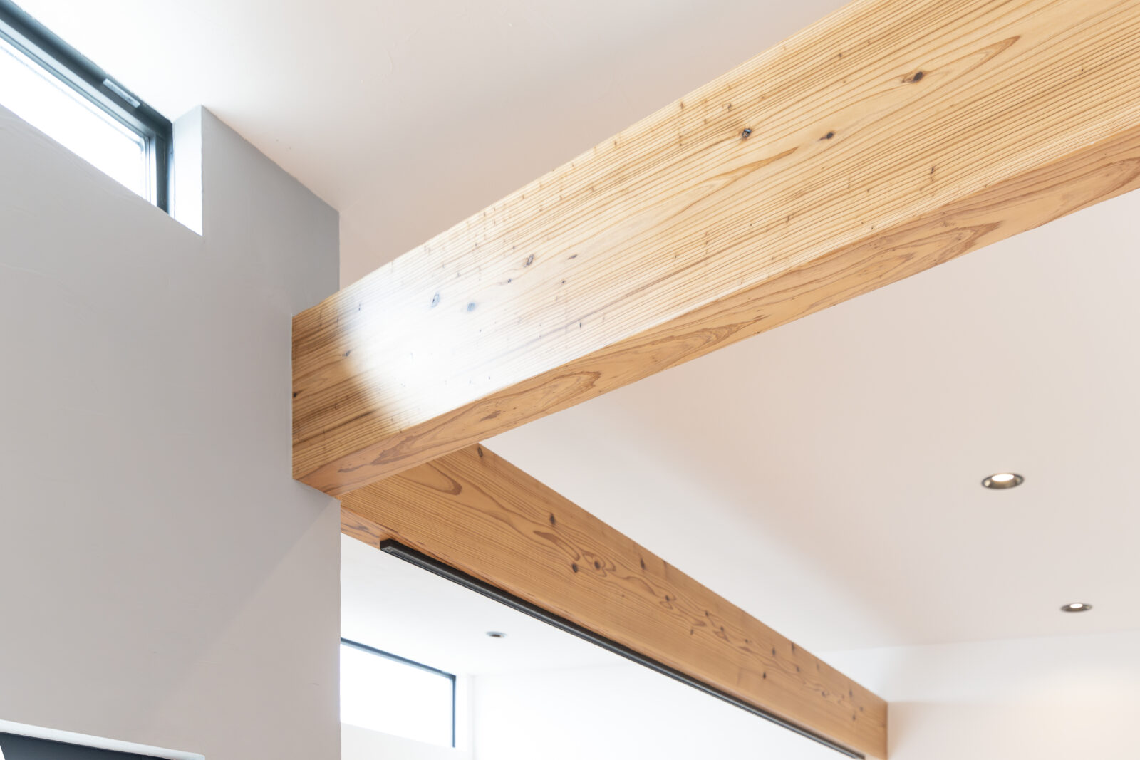 勾配天井のリビングにハイサイド窓を設けることで、外部からの自然光が入る開放的なLDK空間となりました。内壁を漆喰仕上げとしたことで、空間に表情が生まれます。