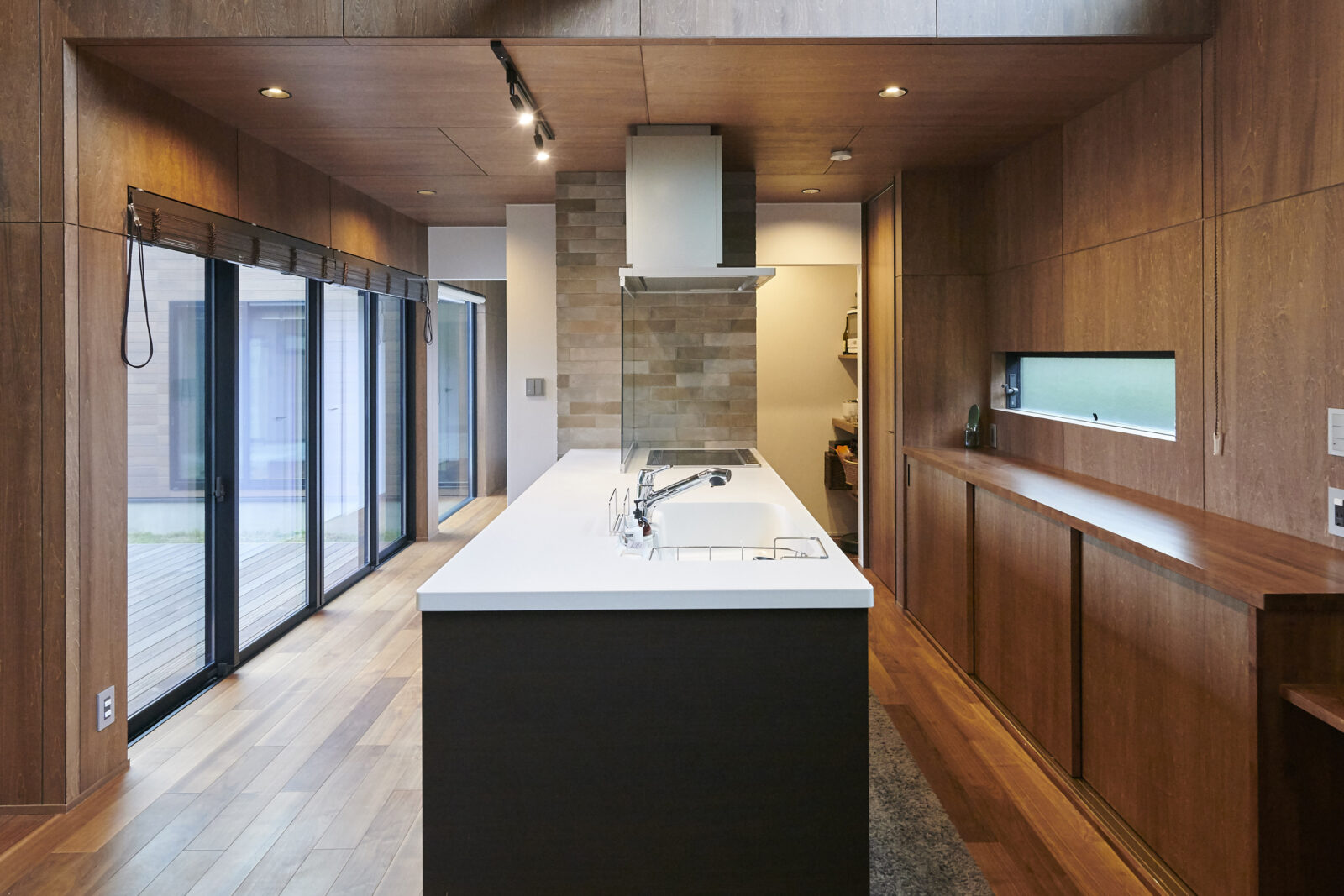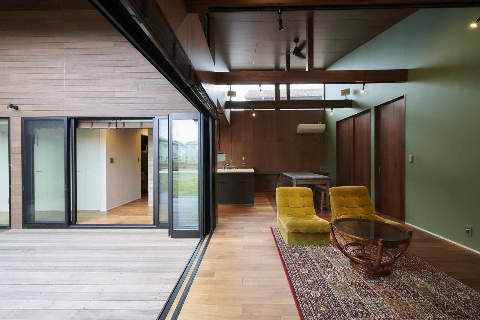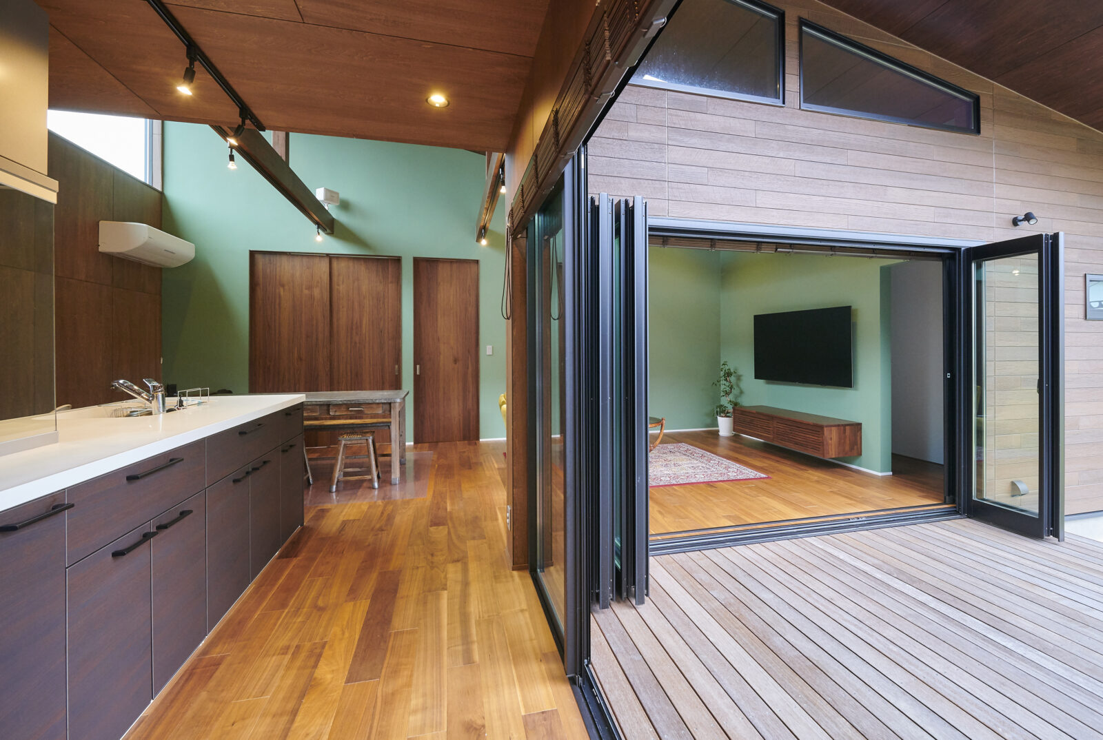 ウッドデッキ・リビング・居室・水廻りがゆるやかに繋がり、