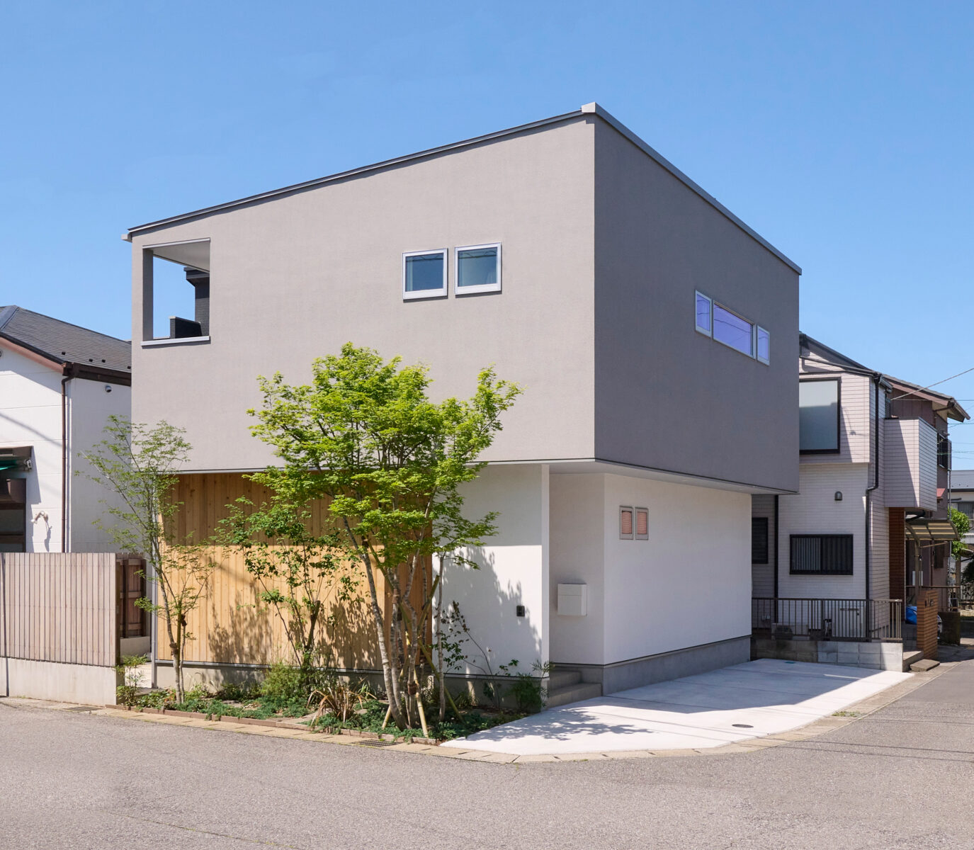 道路側の2面をオーバーハングさせた、異なる色と素材で作り上げられたシンプルな外観。