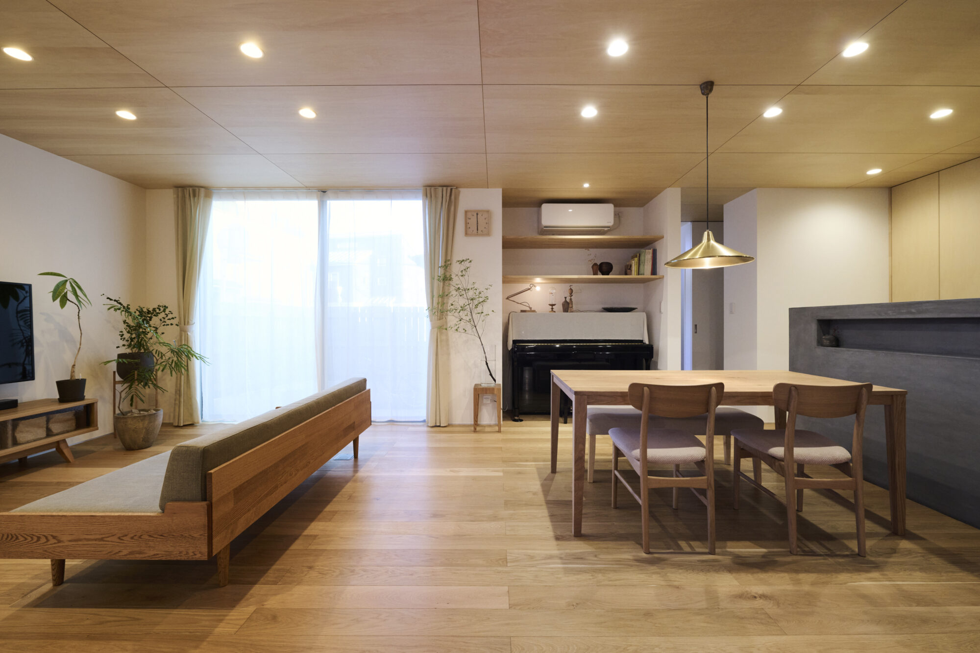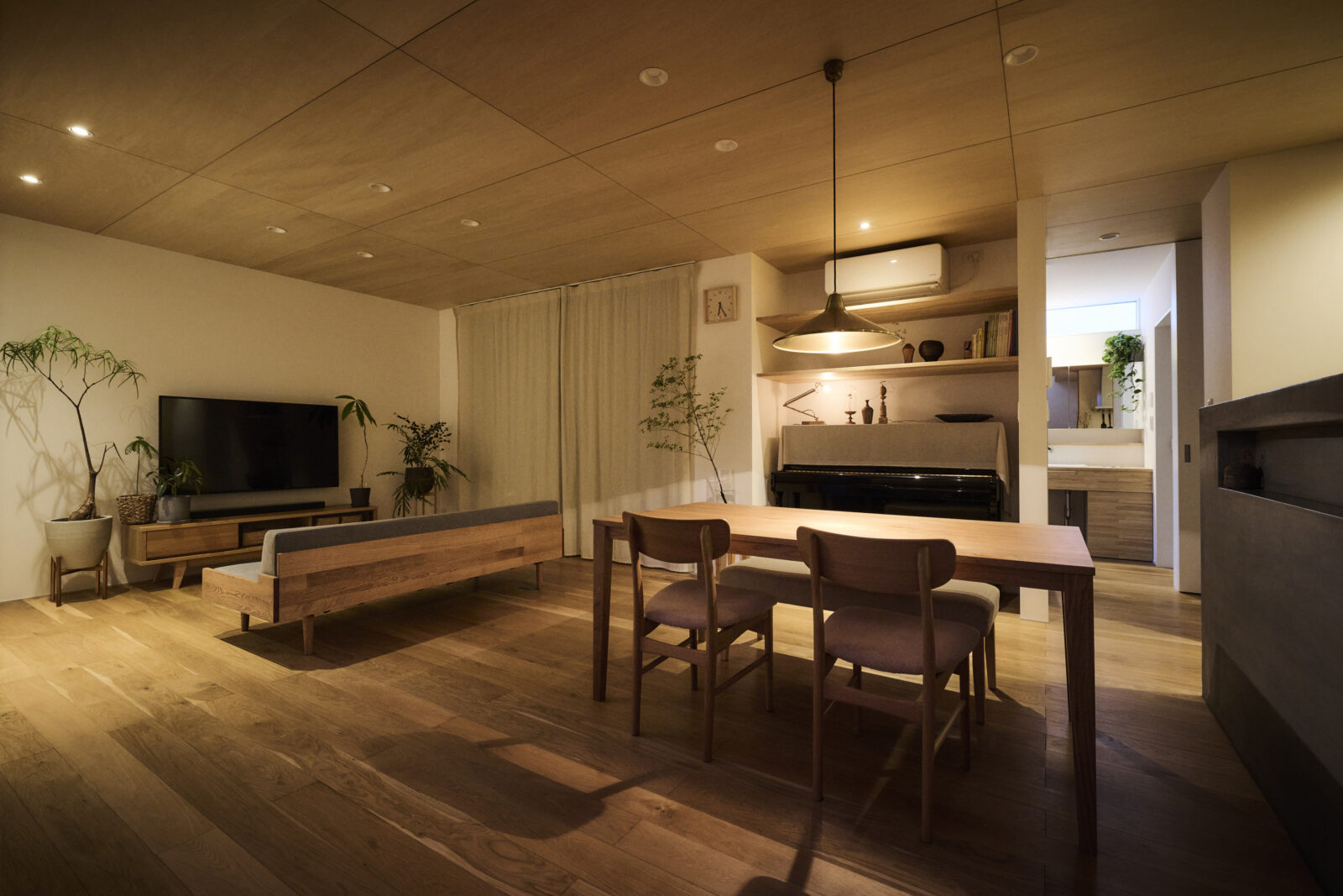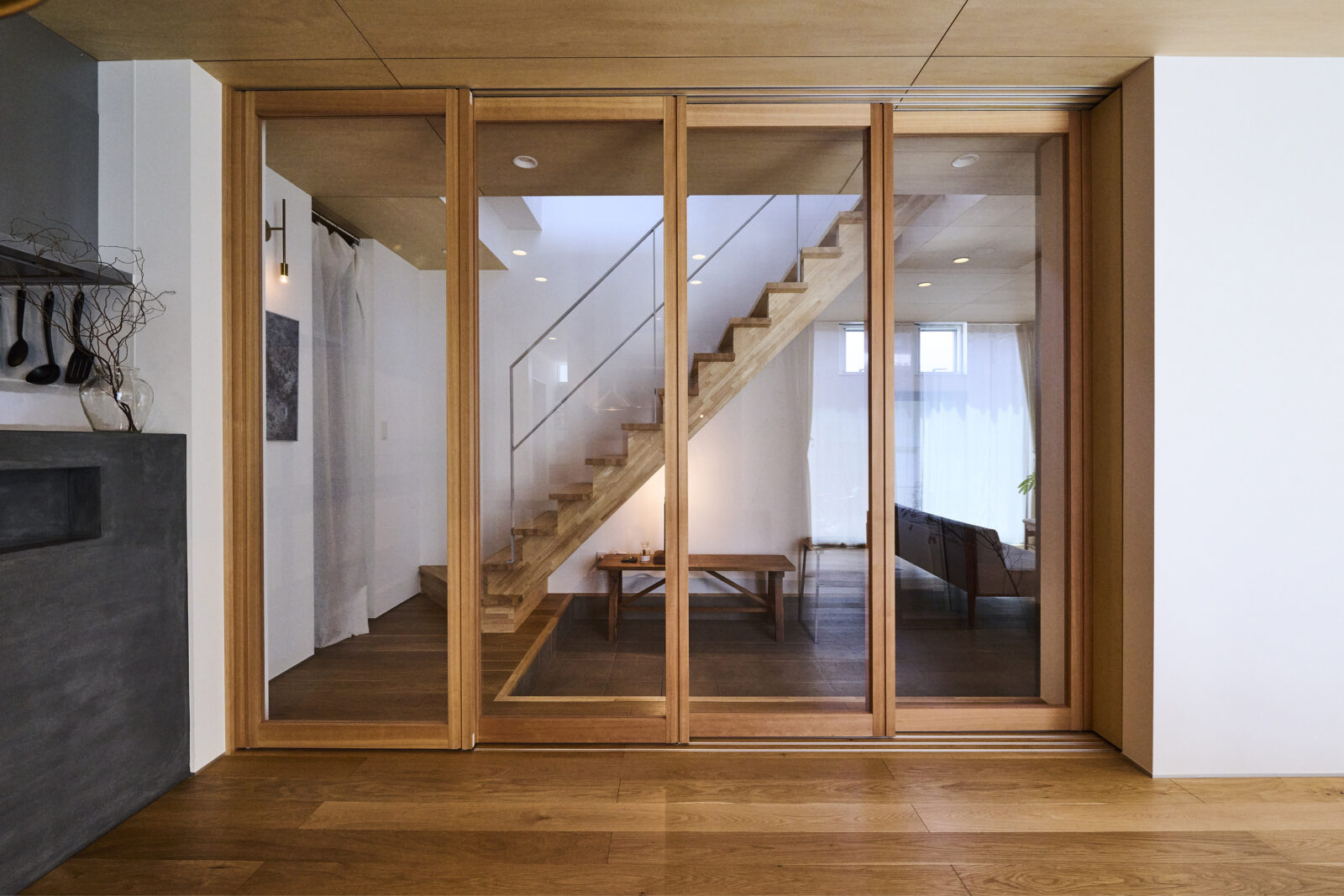 玄関土間とLDKをつなげる木製の引き戸は一体感を感じられ、壁に収納できる機能性もあります。