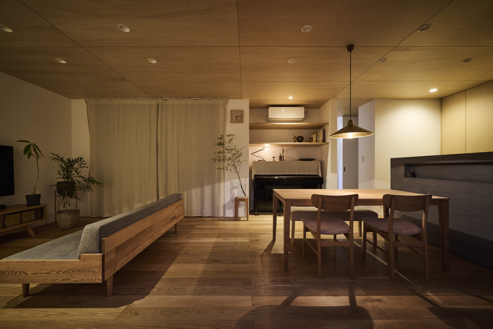 LDKはモルタルキッチンや土間のカッチリ感と、やわらかさと木のあたたかみが溶け込む空間。