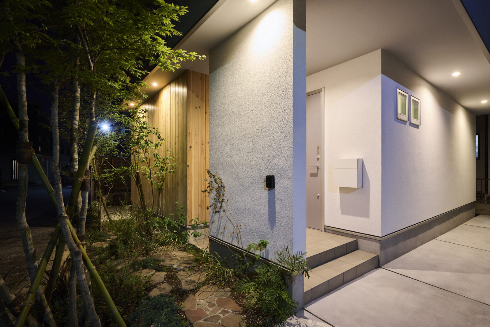 Lightly 建築エリア 千葉県 建築年 2020 敷地面積 131.83m² 延床面積 112.2m² 道路側の2面をオーバーハングさせた、異なる色と素材で作り上げられたシンプルな外観。 南側に大きなマドを取り入れ採光を確保し、道路に対して閉じたプライバシーに配慮したお住まいです。 LDKはモルタルキッチンや土間のカッチリ感と、やわらかさと木のあたたかみが溶け込む空間。 玄関土間とLDKをつなげる木製の引き戸は一体感を感じられ、壁に収納できる機能性もあります。 設計士、お施主様と一緒にディティールまで細かく打合せを重ね製作された階段手摺は 空間と統一感を感じられながらも、すっきりとした見た目で軽やかに2階へ導いてくれます。 玄関に入って正面にみえる真鍮の照明器具は、お施主様支給のこだわりの一品です。