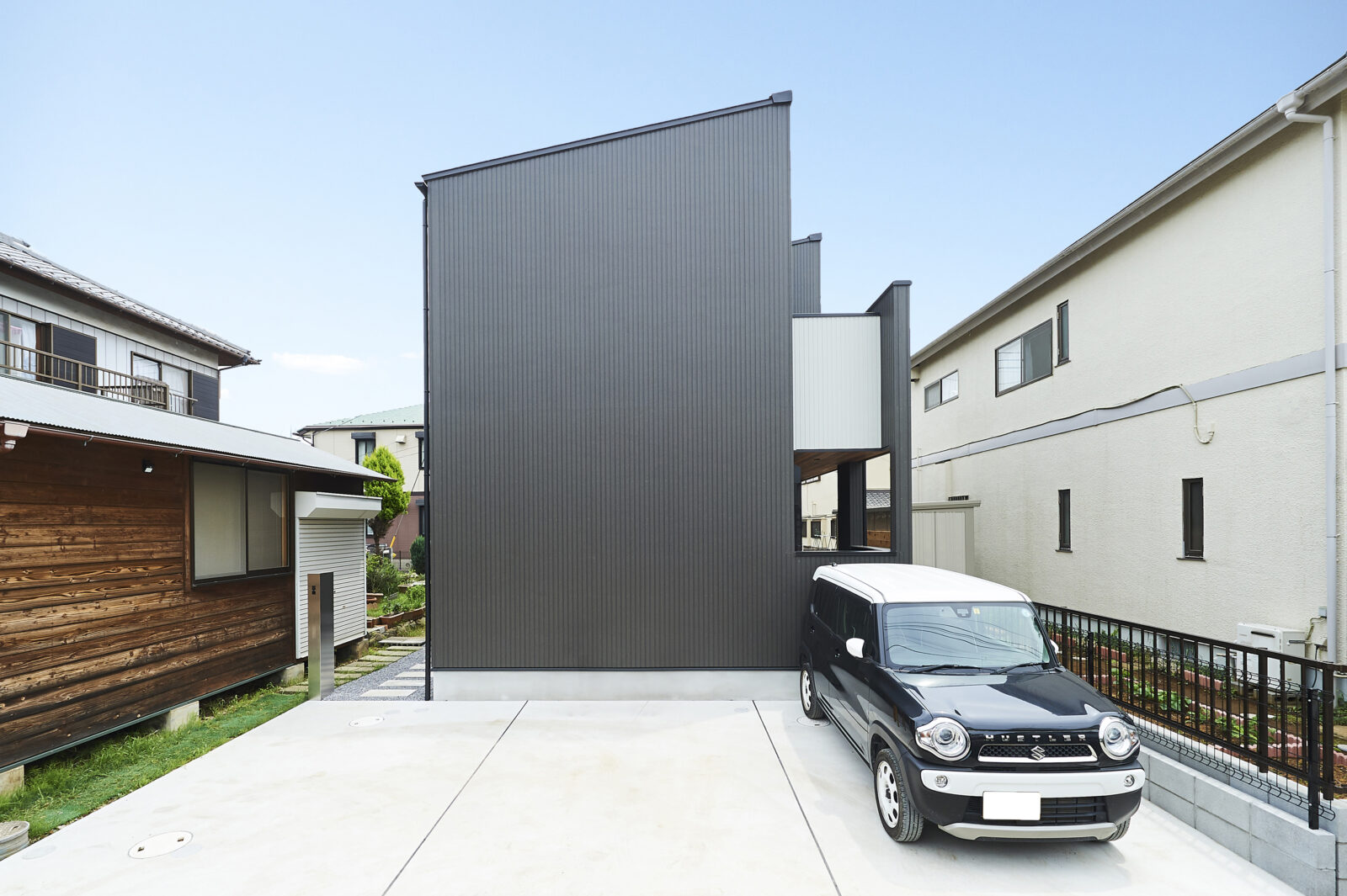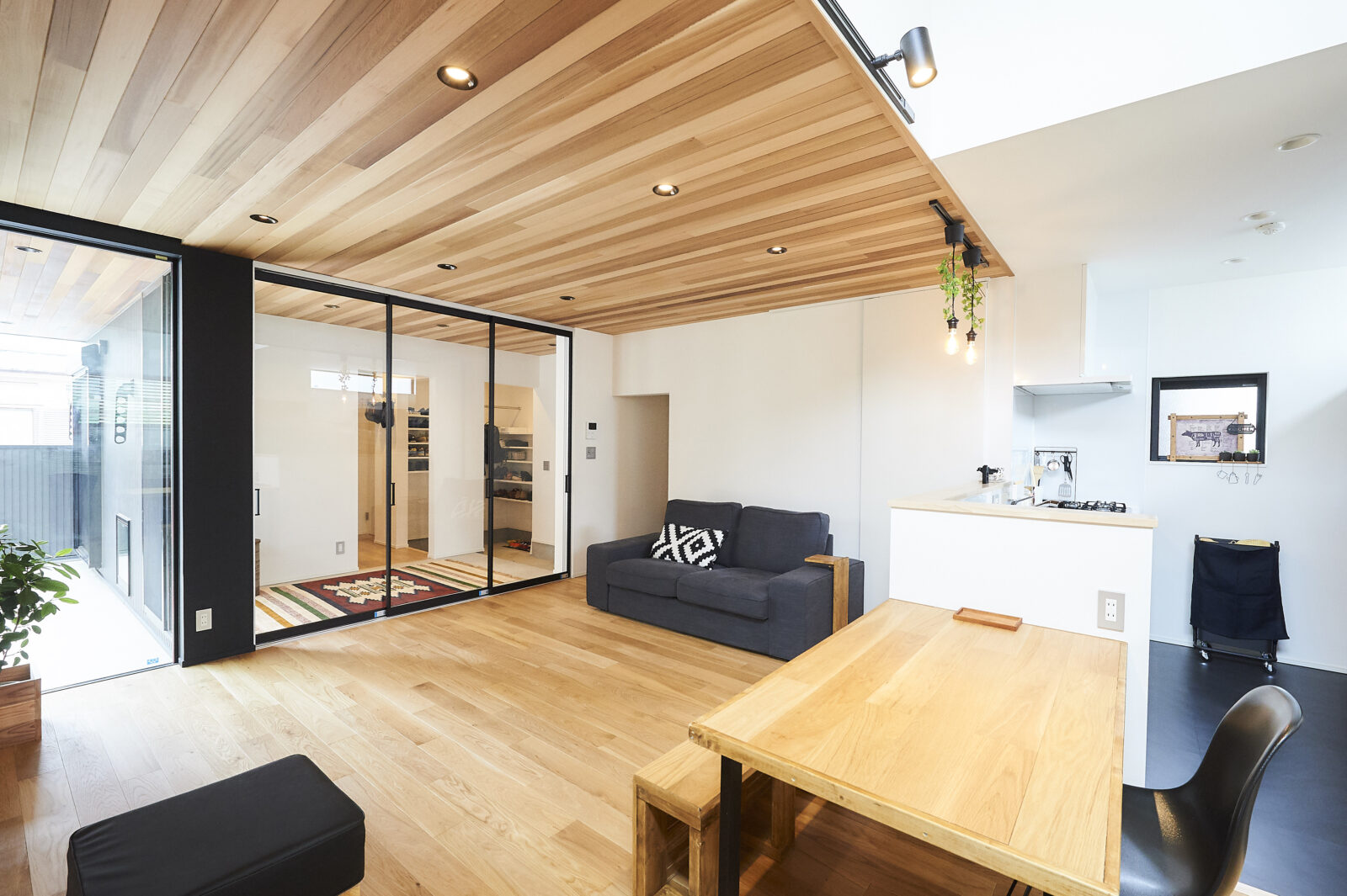 LINK 建築エリア 千葉県 建築年 2017 敷地面積 132.25m² 延床面積 96.25m² 玄関を開けるとモルタルの床とレッドシダーの天井が、まっすぐとテラスまで続きます。 ホールとテラスの仕上げをそろえることで、ナカとソトをあいまいにし、スムーズに空間をLINKしています。 ホールとLDKはブラックフレームのインナーウインドウで間仕切りすることで、つながりつつも独立した空間として意識させ、 温かみのある木の素材感とモルタルやブラックフレームのハードさが、バランスよくミックスされた居心地のよい空間に仕上がりました。 エントランス、LDK、WIC、テラス、水回りを集約し、それぞれの空間を上手にLINKさせ、スムーズな動線を実現。 素材、空間、暮らしを楽しむことができる家が完成しました。