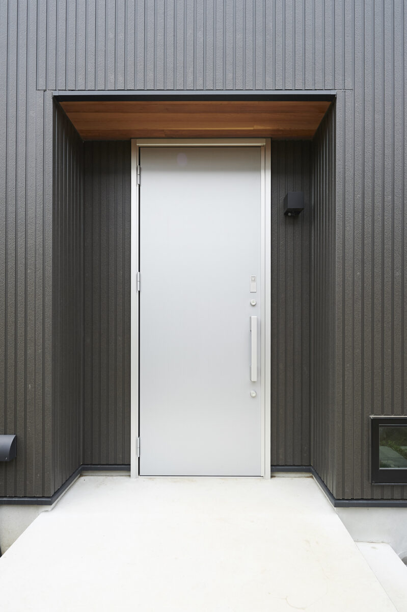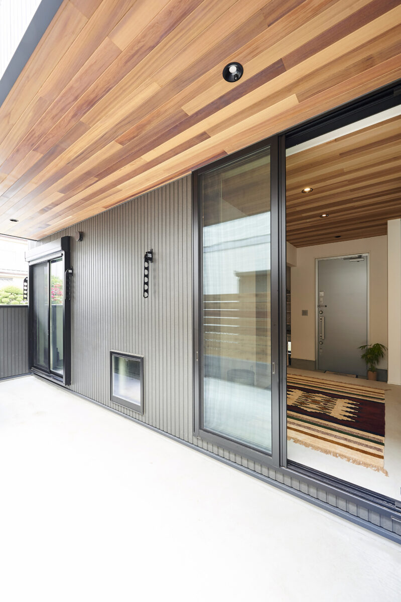 玄関を開けるとモルタルの床とレッドシダーの天井が、まっすぐとテラスまで続きます。