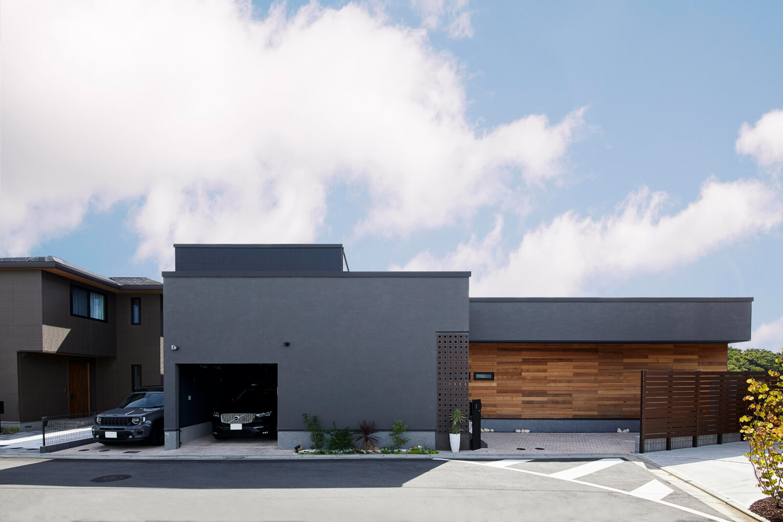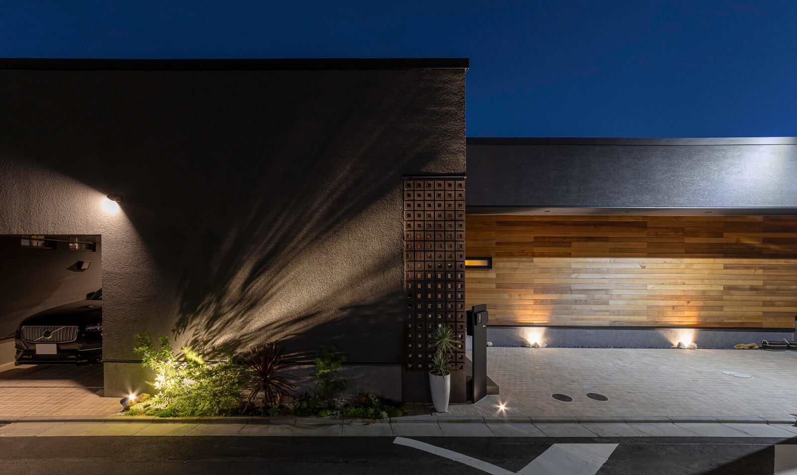 北側のファサードは水平基調で塗り壁をベースに、木と花ブロックでアクセントをつけ重厚感を演出。