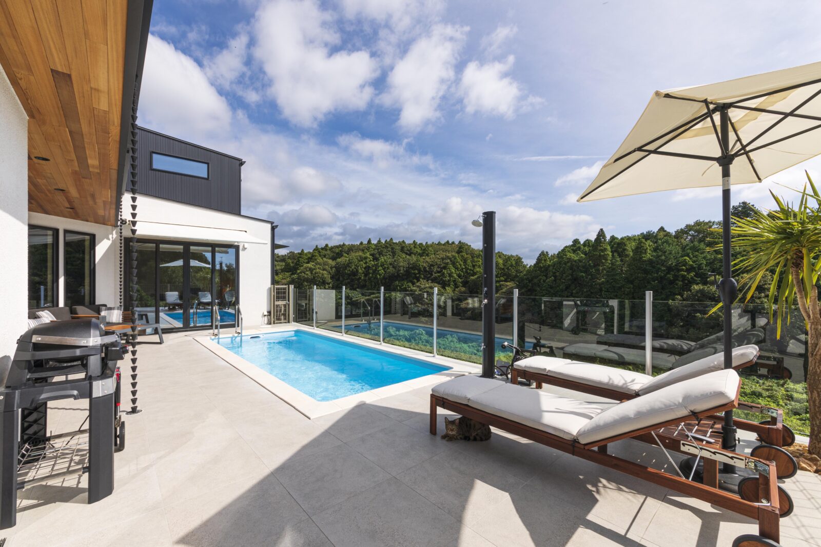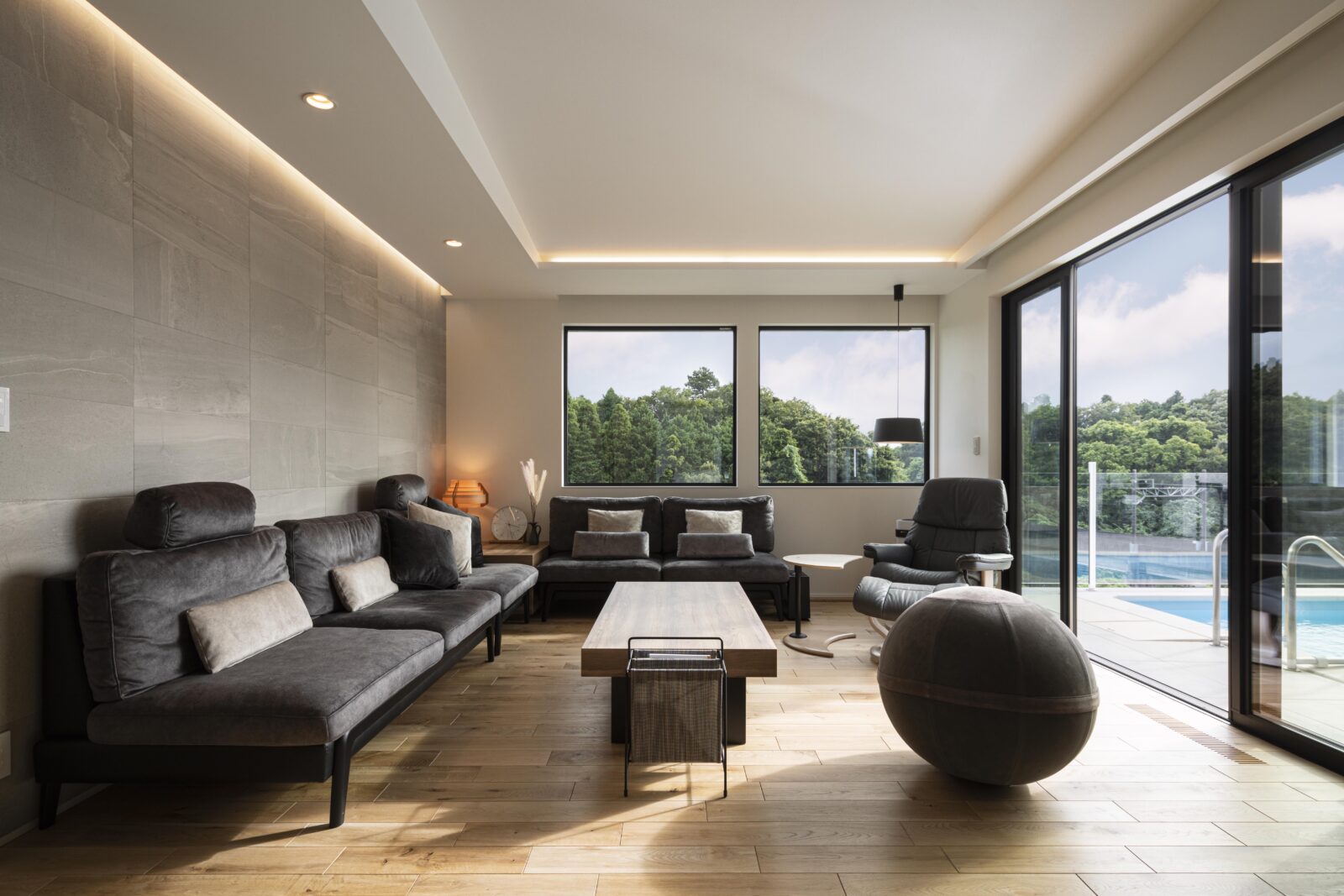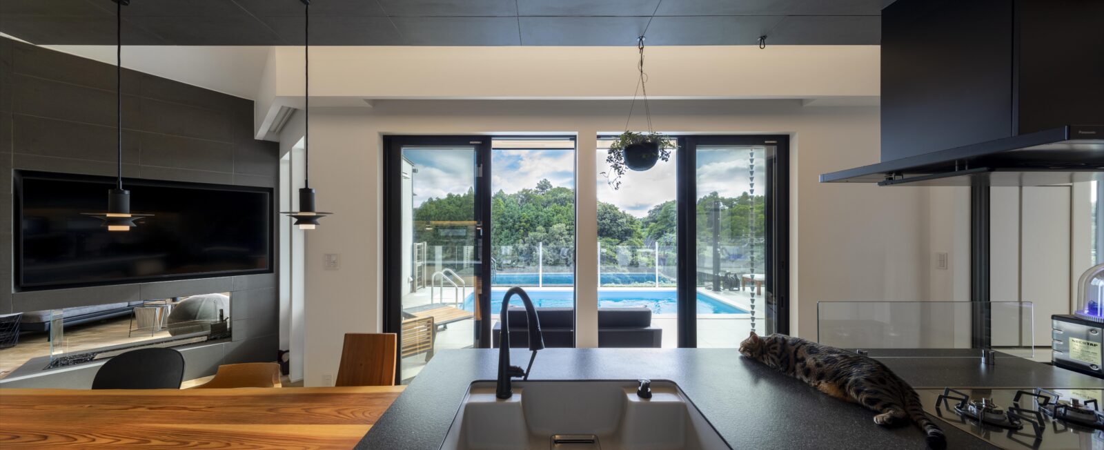 高台で南側に森が広がるロケーションを生かした、南国のリゾート地にいるような非日常空間の住宅。
