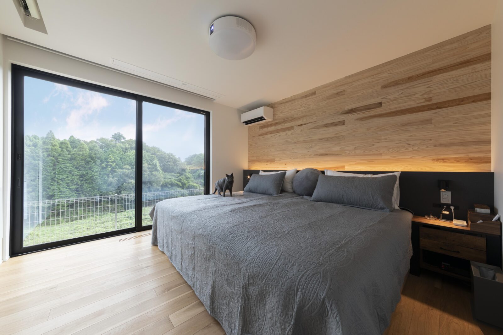 書斎は落ち着いて作業ができるように黒を基調に構成し、デスクに座った際に目線の先に森が広がる位置に開口を設置。